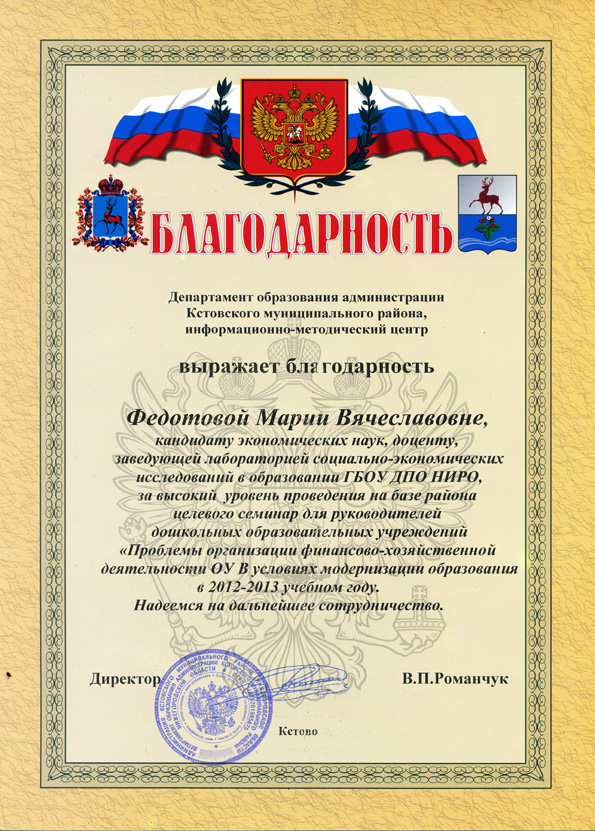 - Благодарность от департамента образования администрации Кстовского муниципального района