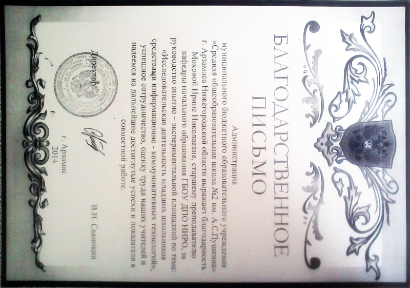 - Благодарность от администрации и педагогического коллектива МБОУ "Гимназии" г. Арзамаса