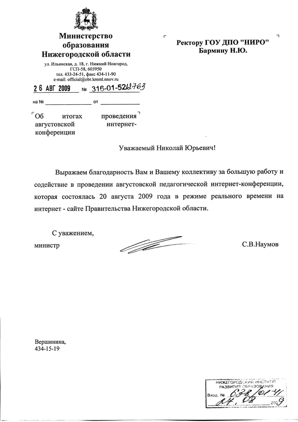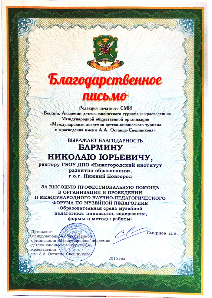 - Благодарность от заместителя министра образования Нижегородской области В. Г. Шахнозарова