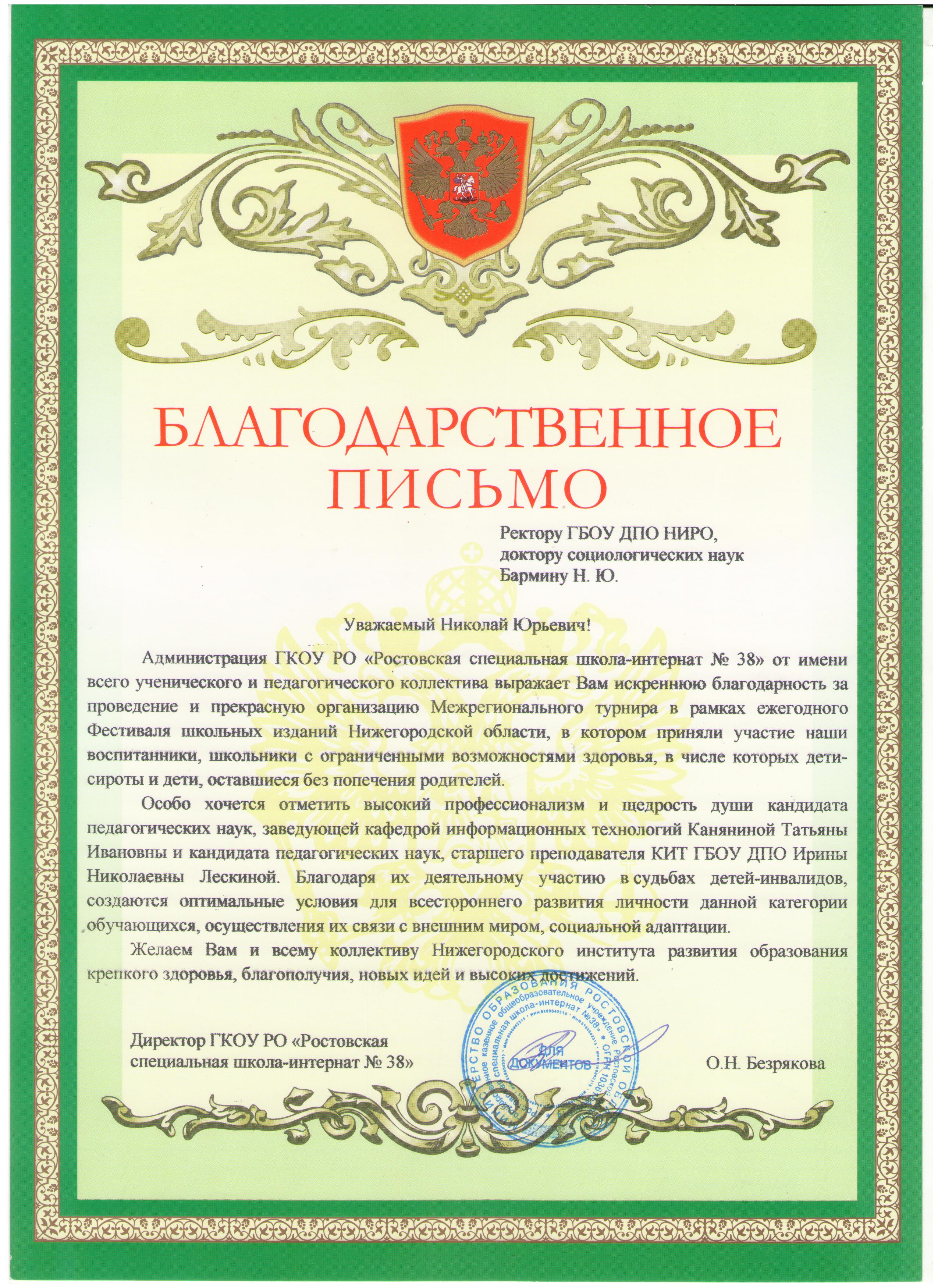 - Благодарность от администрации и педагогического коллектива ГКОУ РО "Ростовская специальная школа-интернат №38"