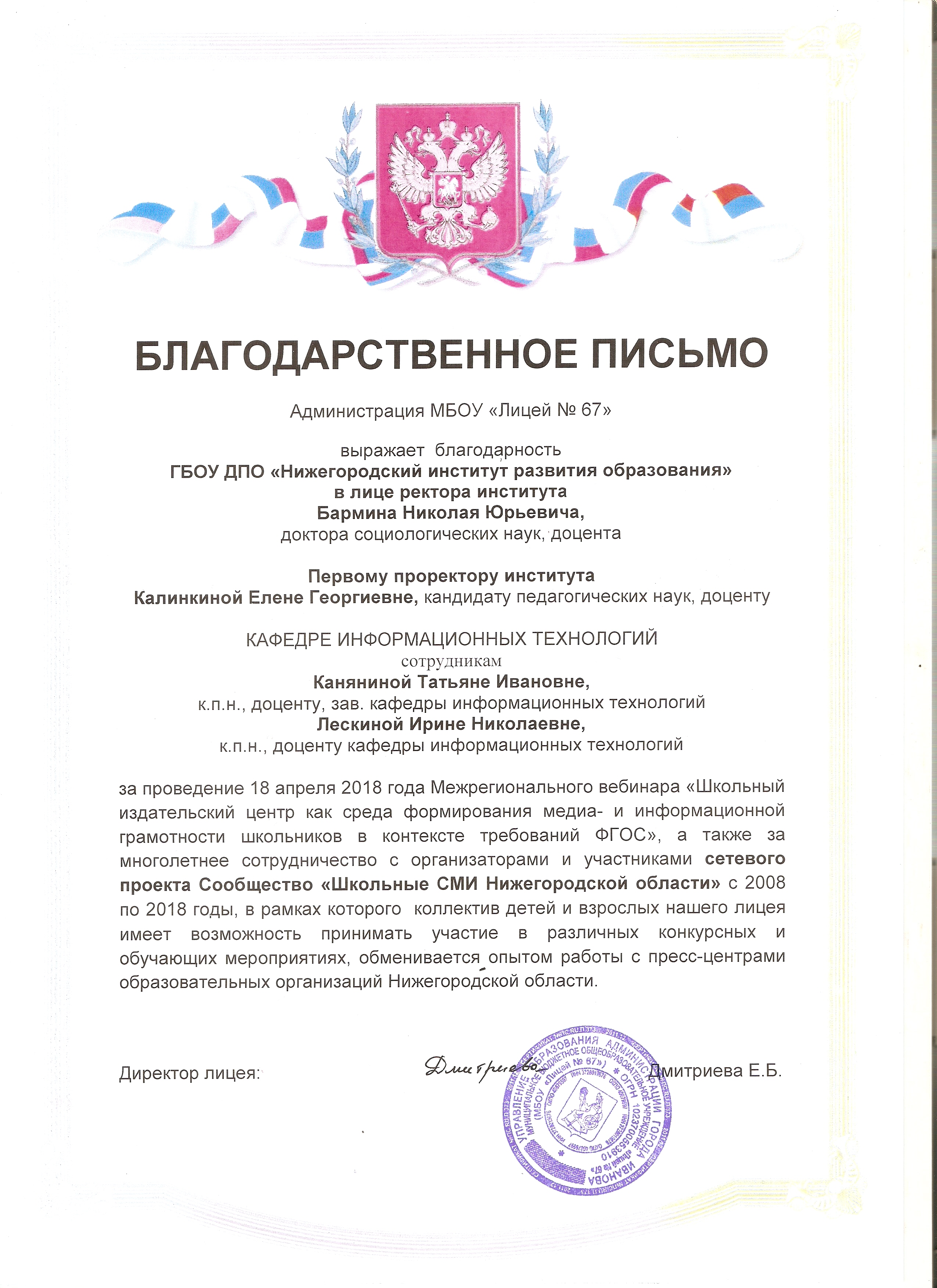 - Благодарность от администрации МБОУ Лицея № 67 г. Иваново