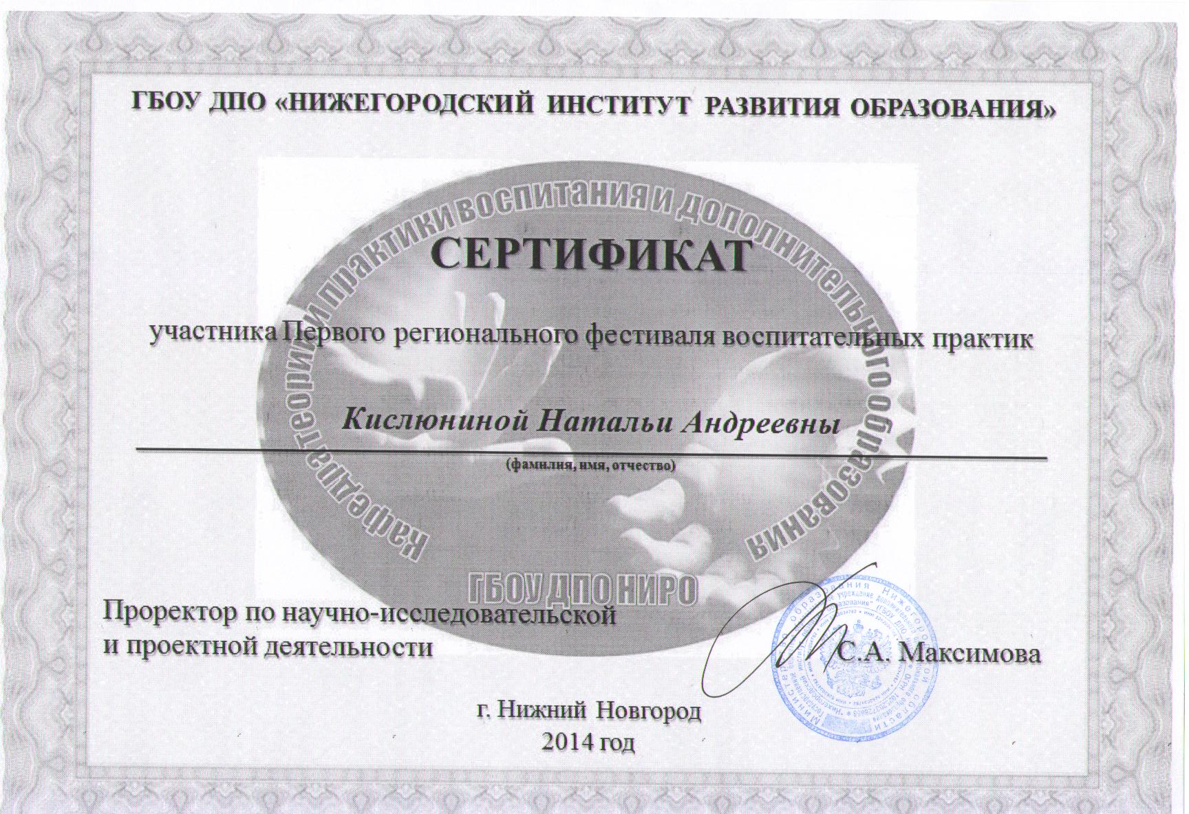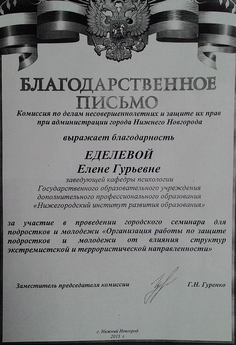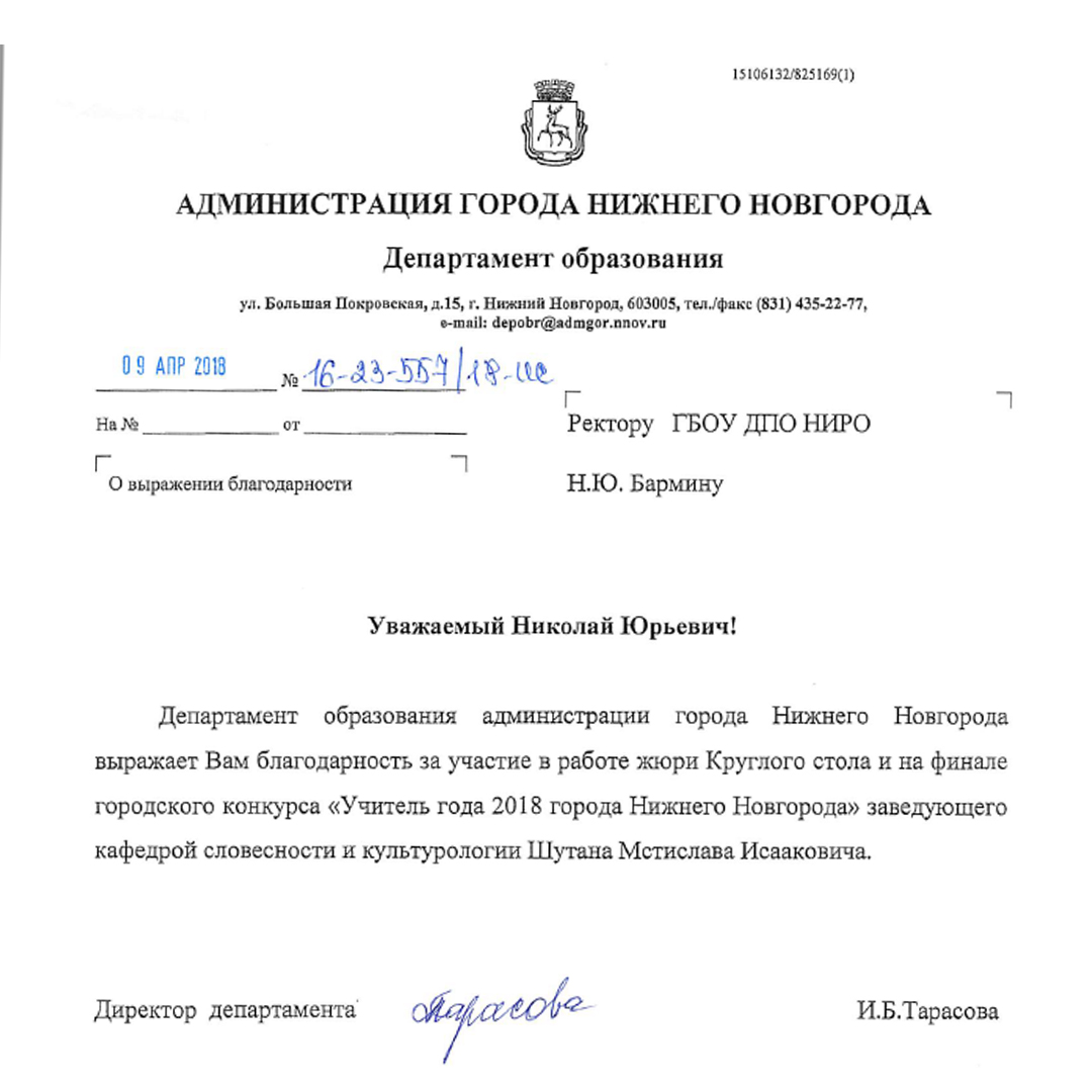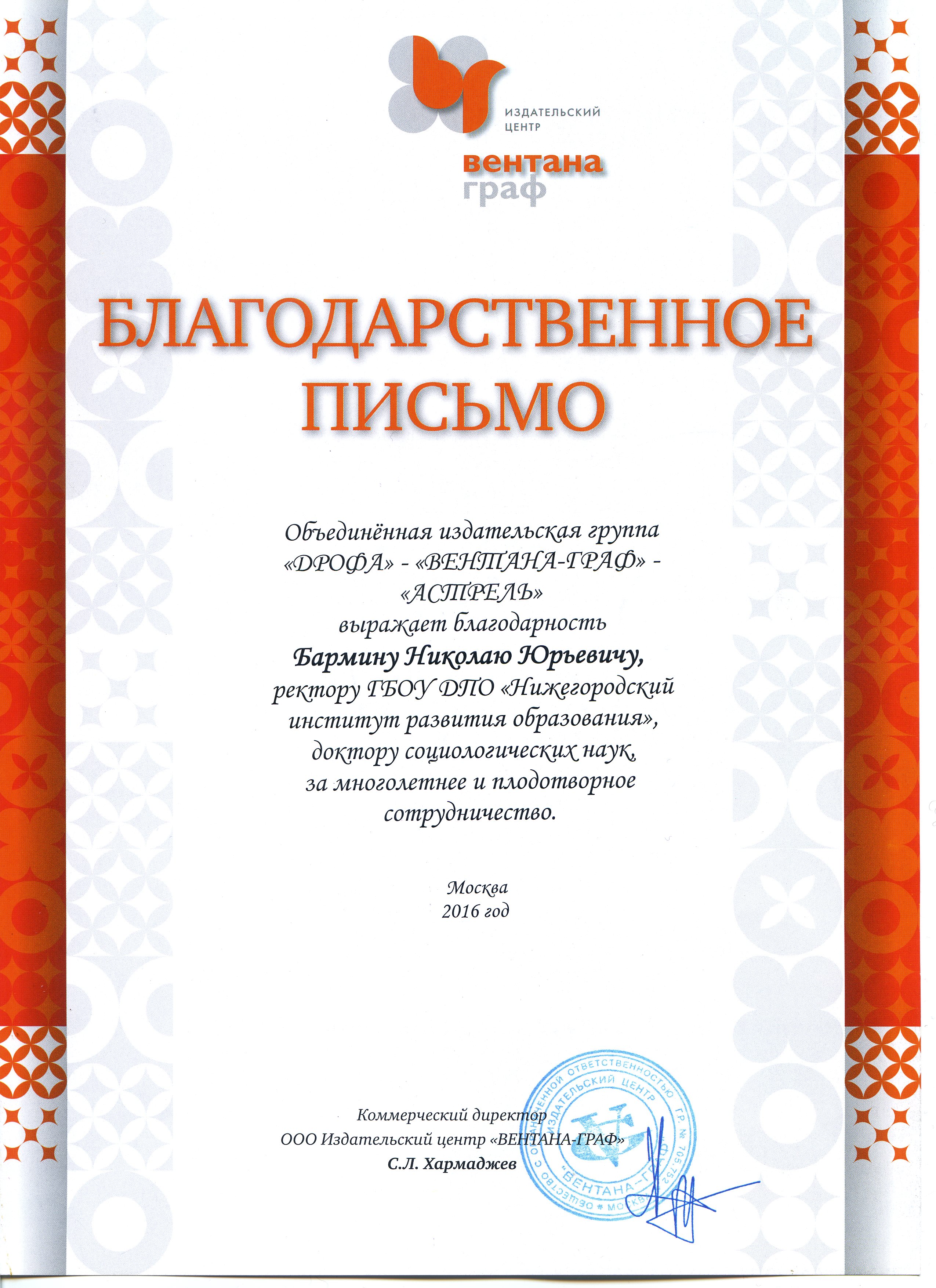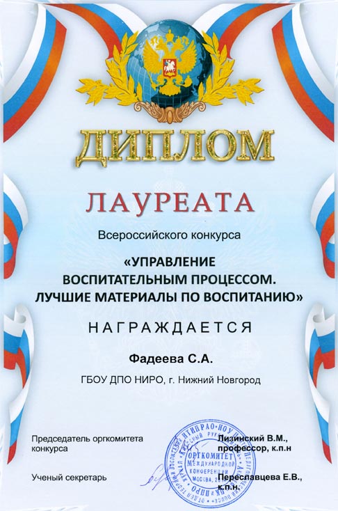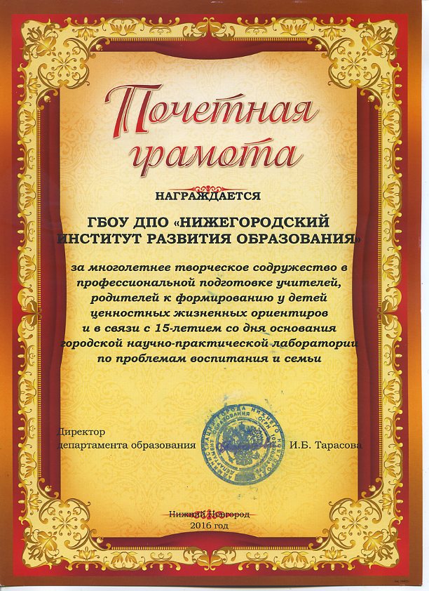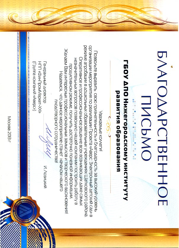- Благодарность от департамента образования администрации города Нижнего Новгорода