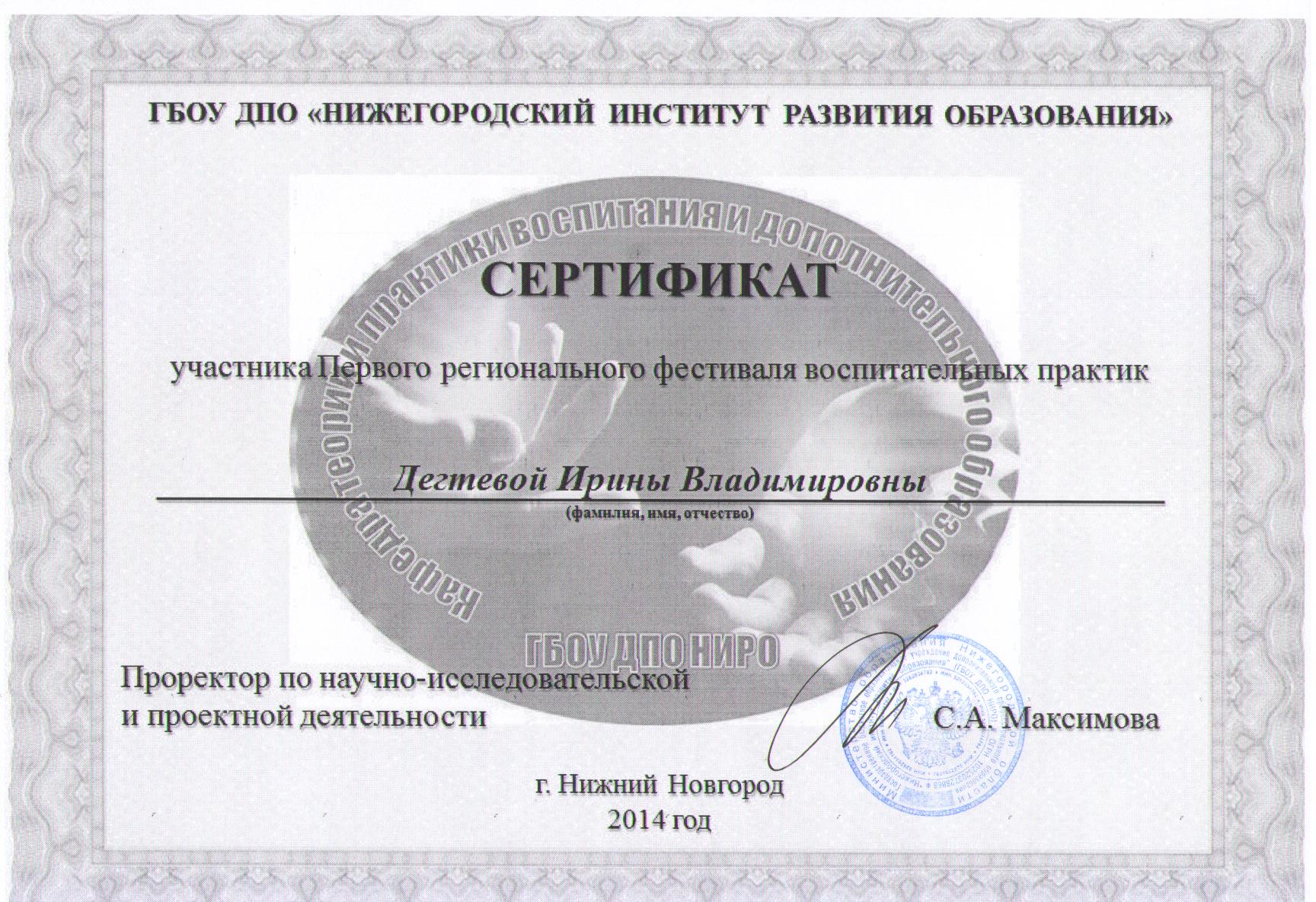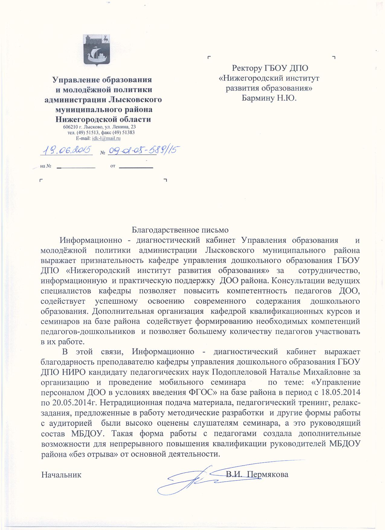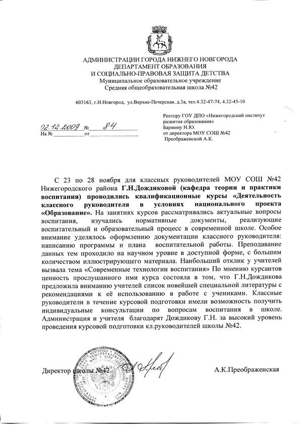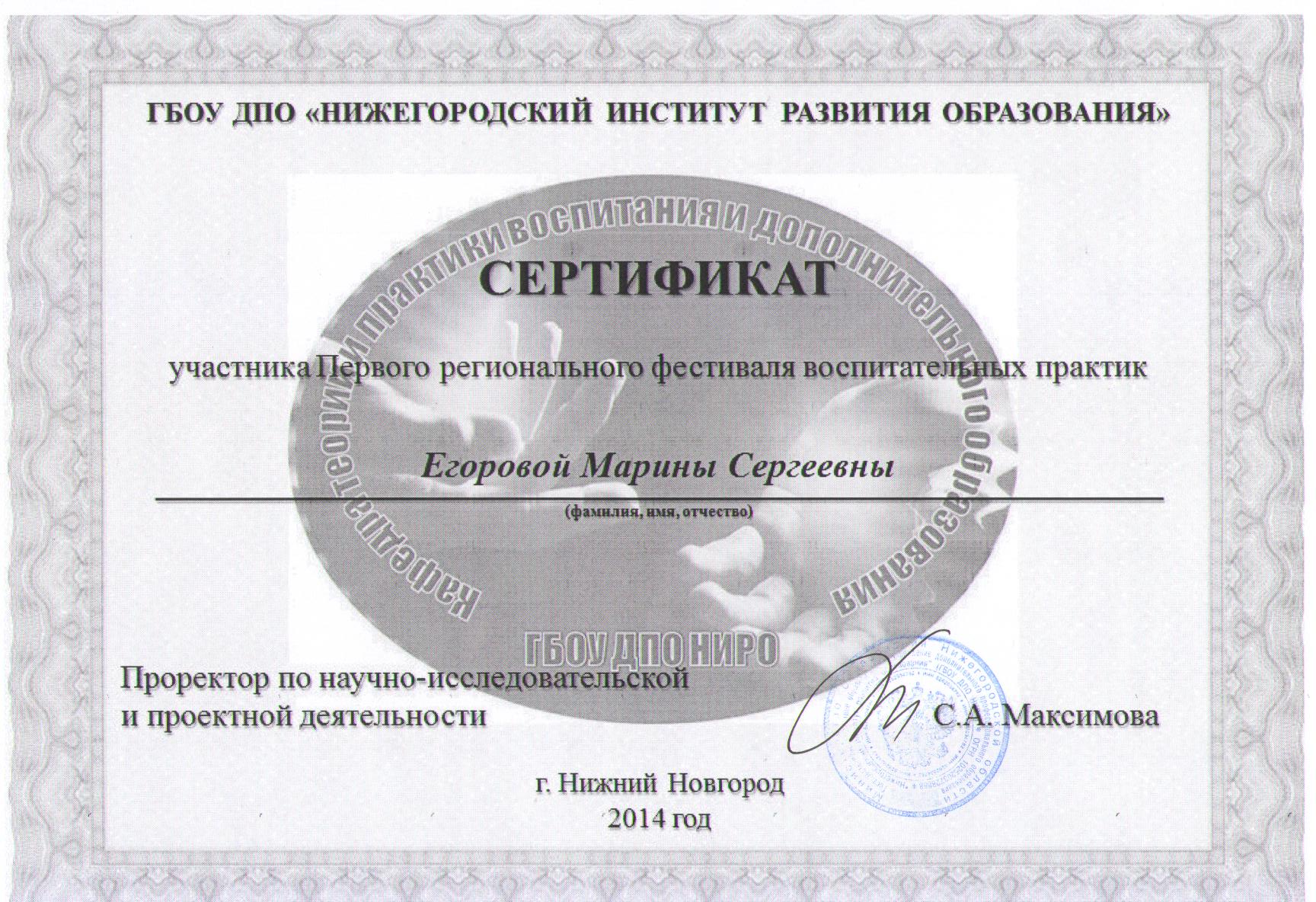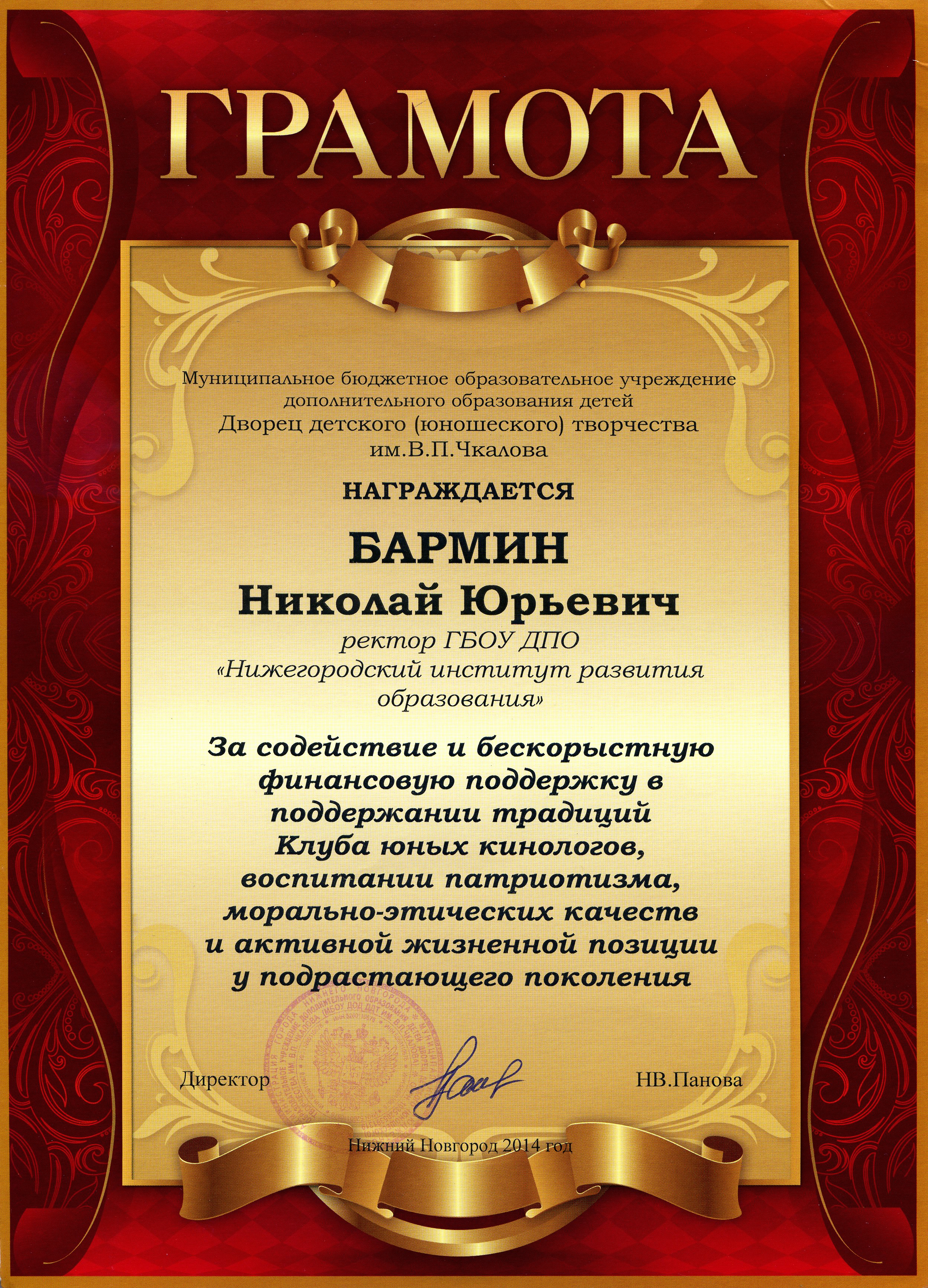 - Благодарность от департамента образования администрации города Нижнего Новгорода