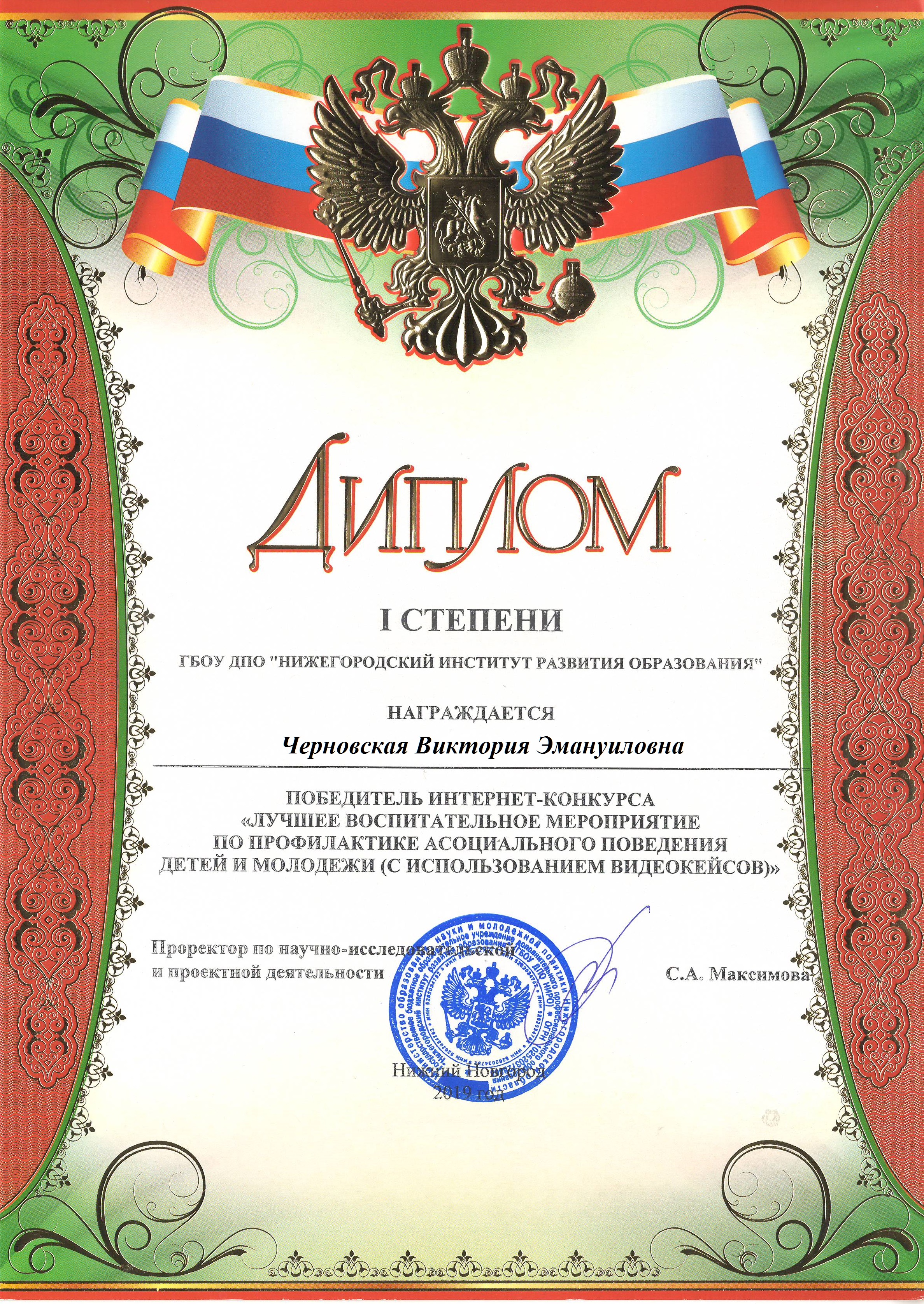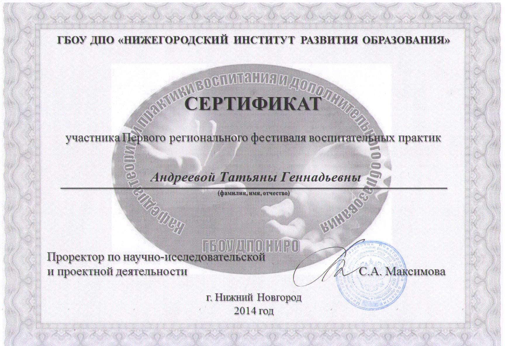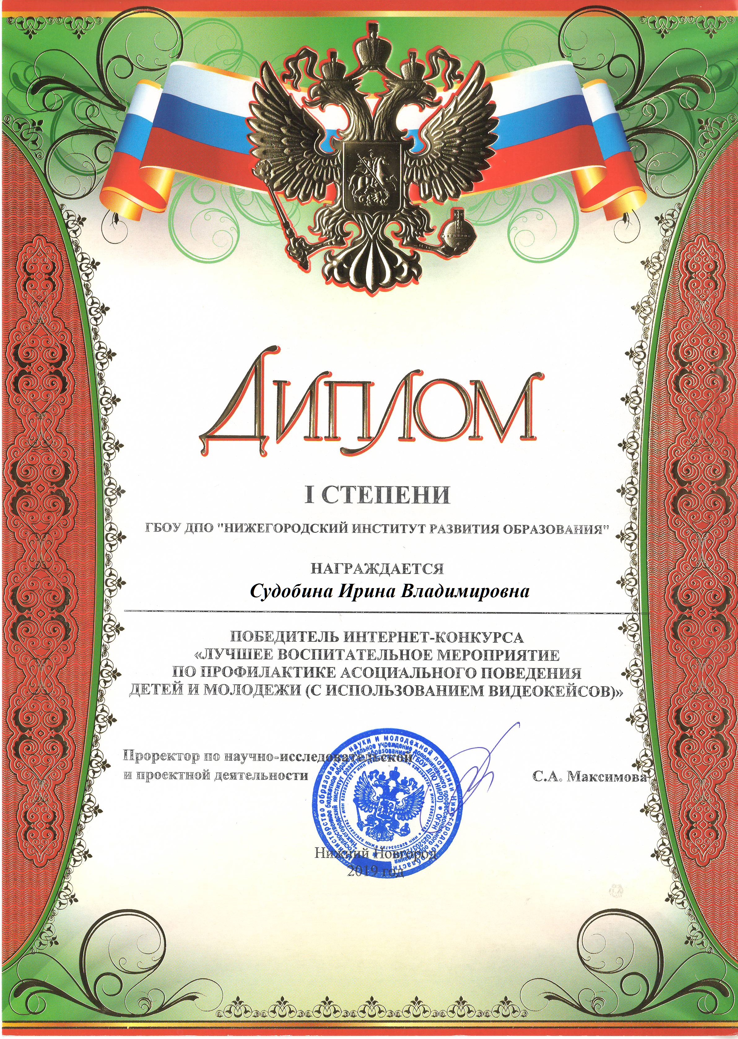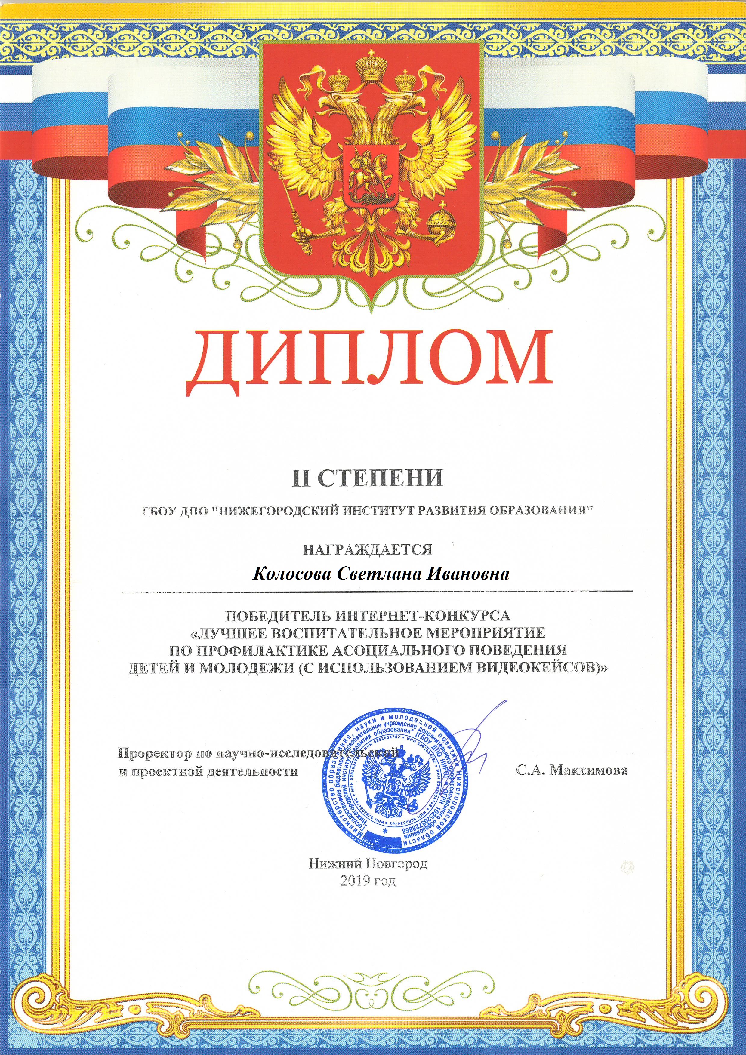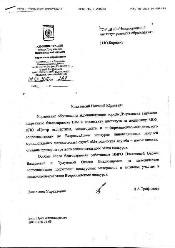 - Благодарность от департамента образования администрации города Нижнего Новгорода