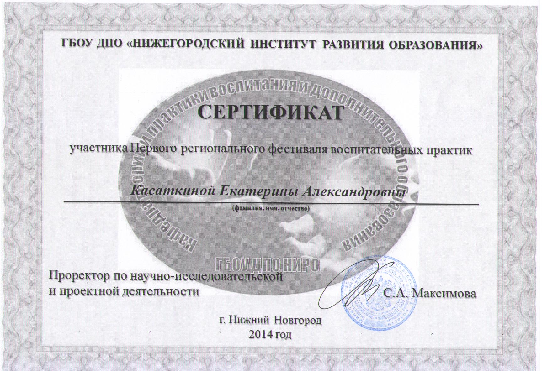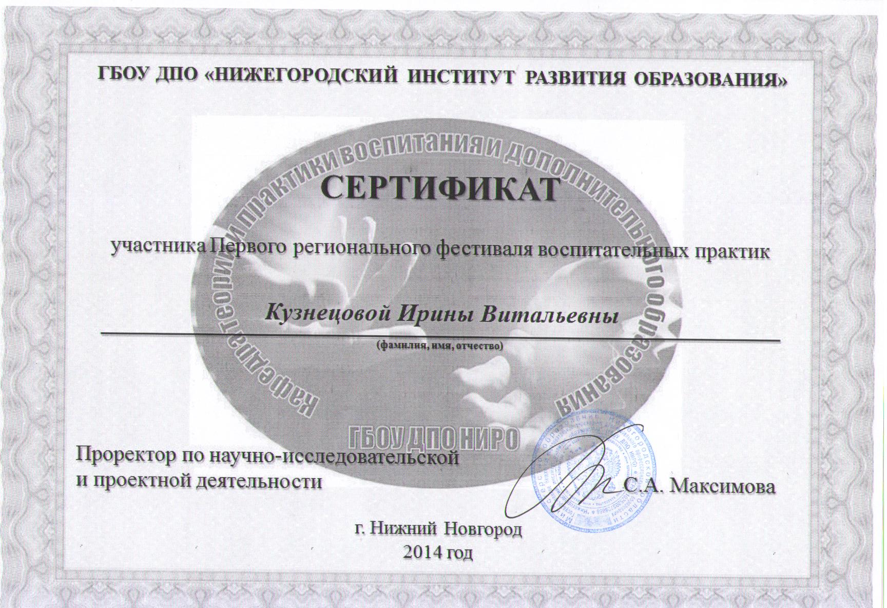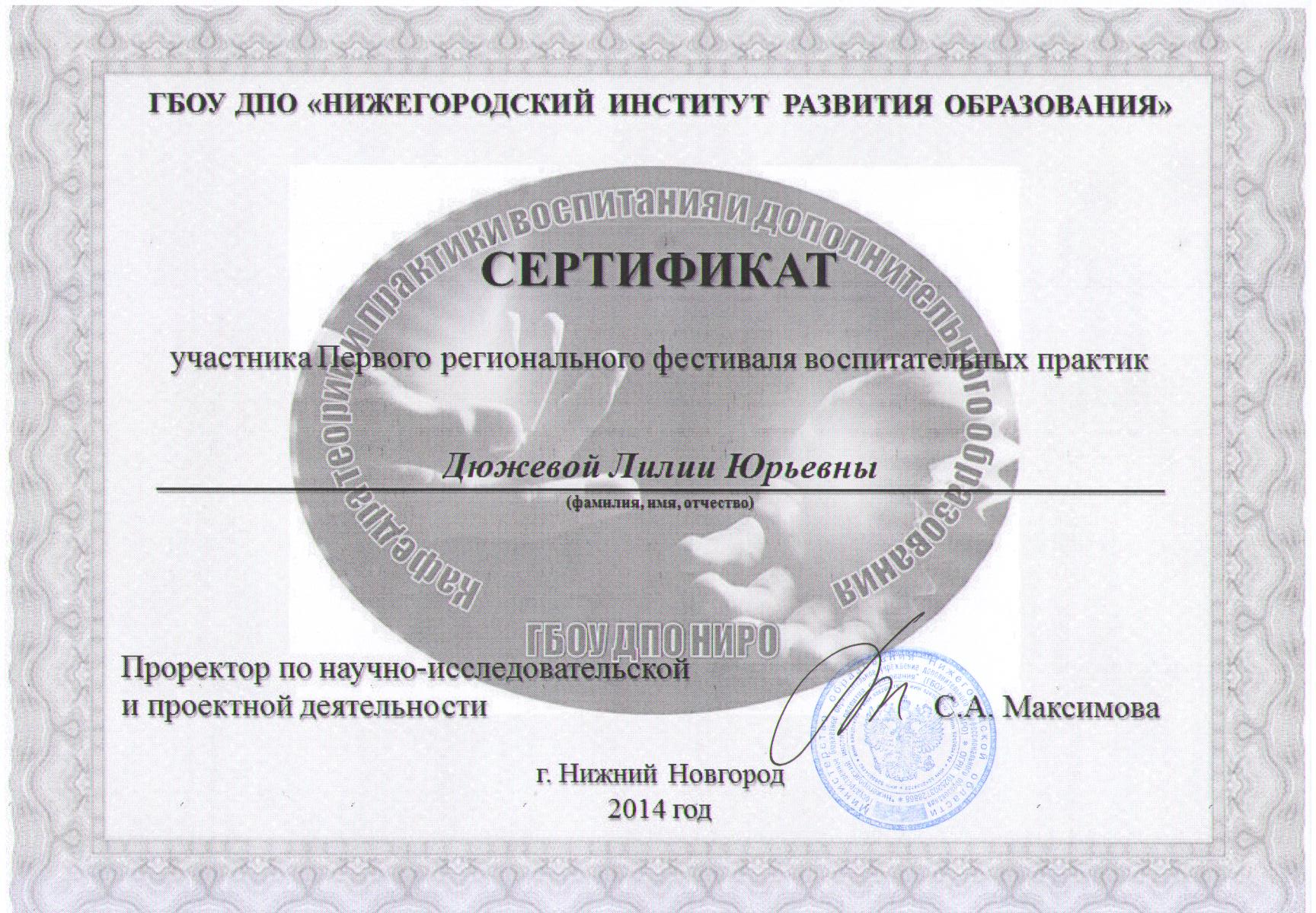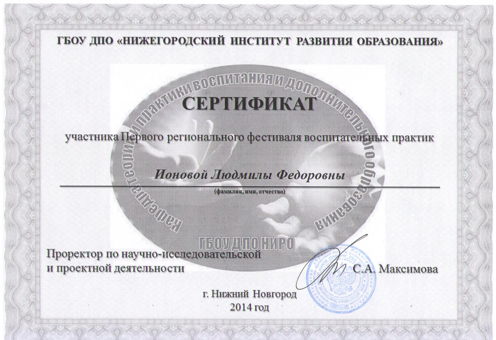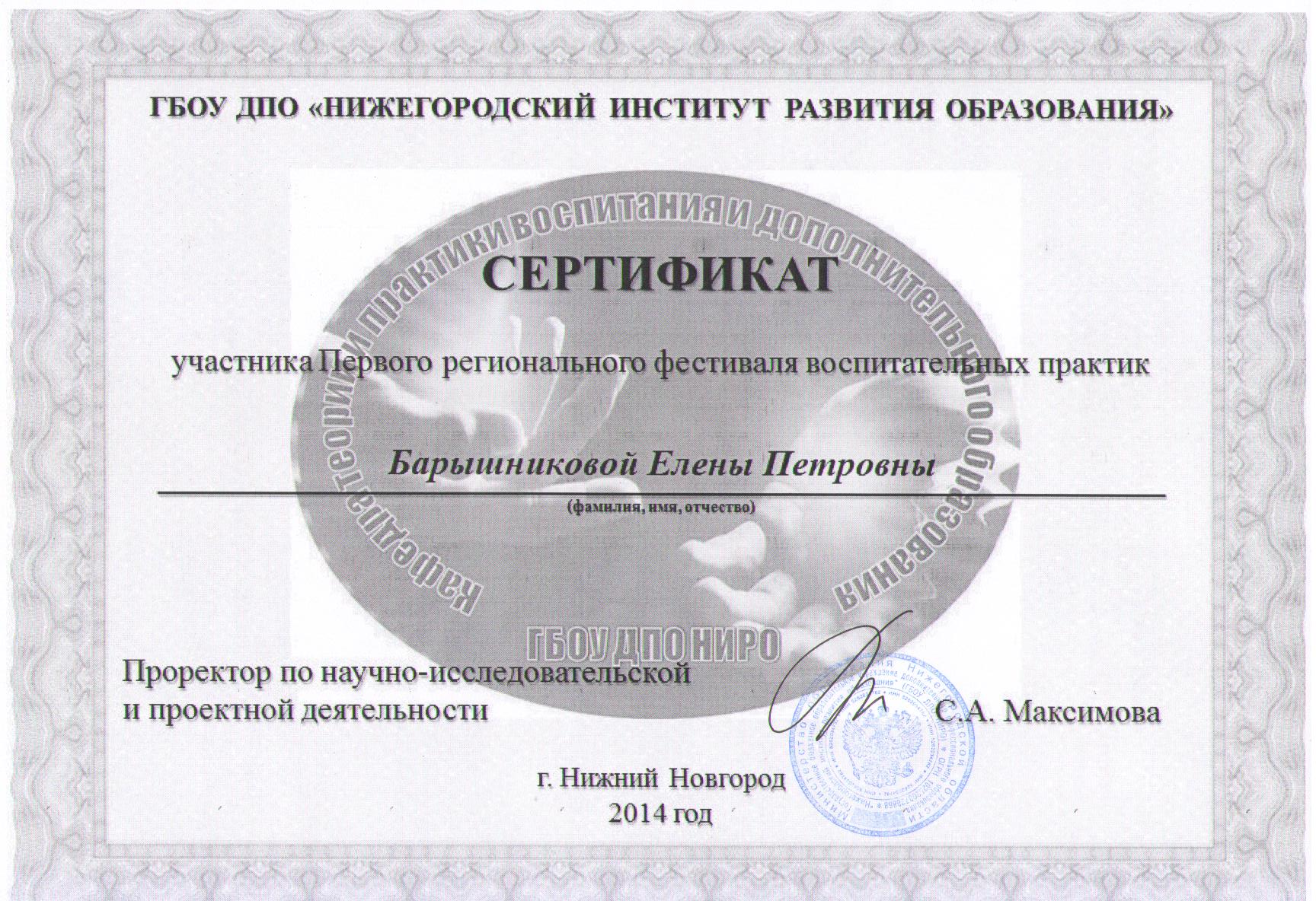 - Благодарность от департамента образования администрации города Нижнего Новгорода