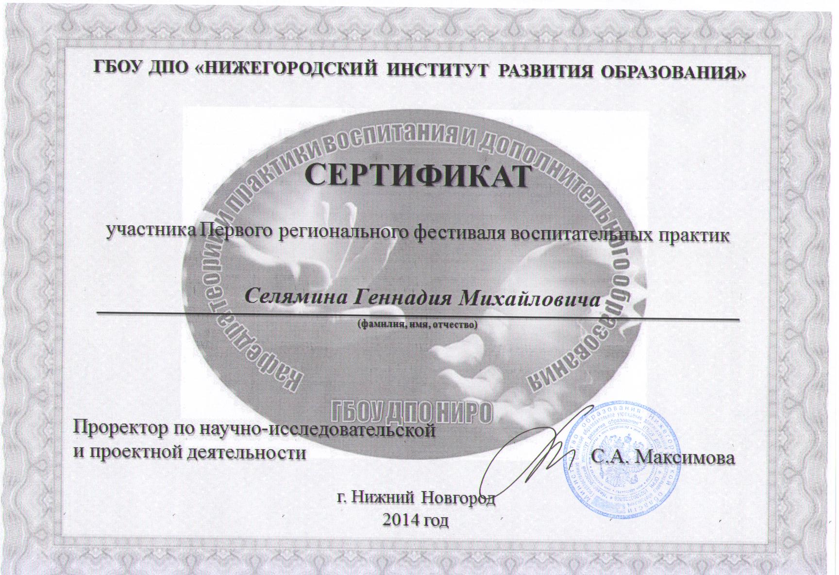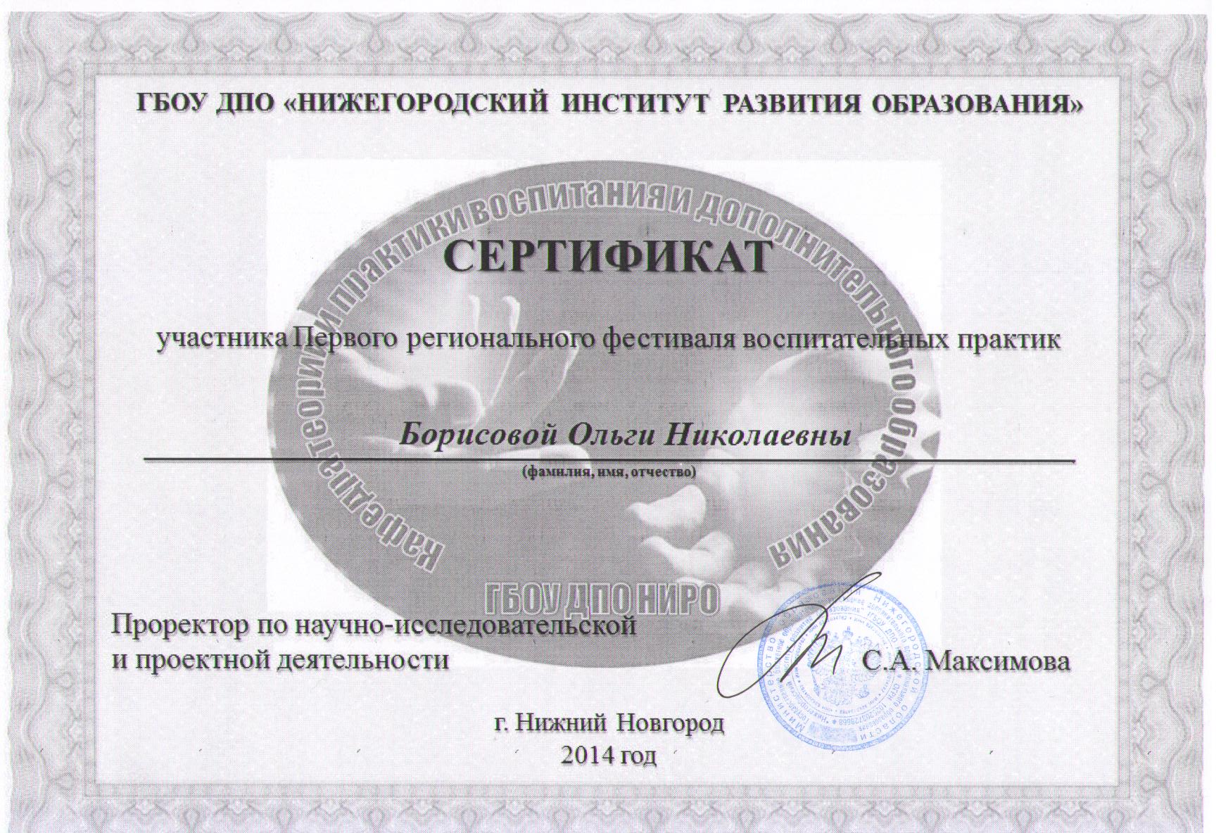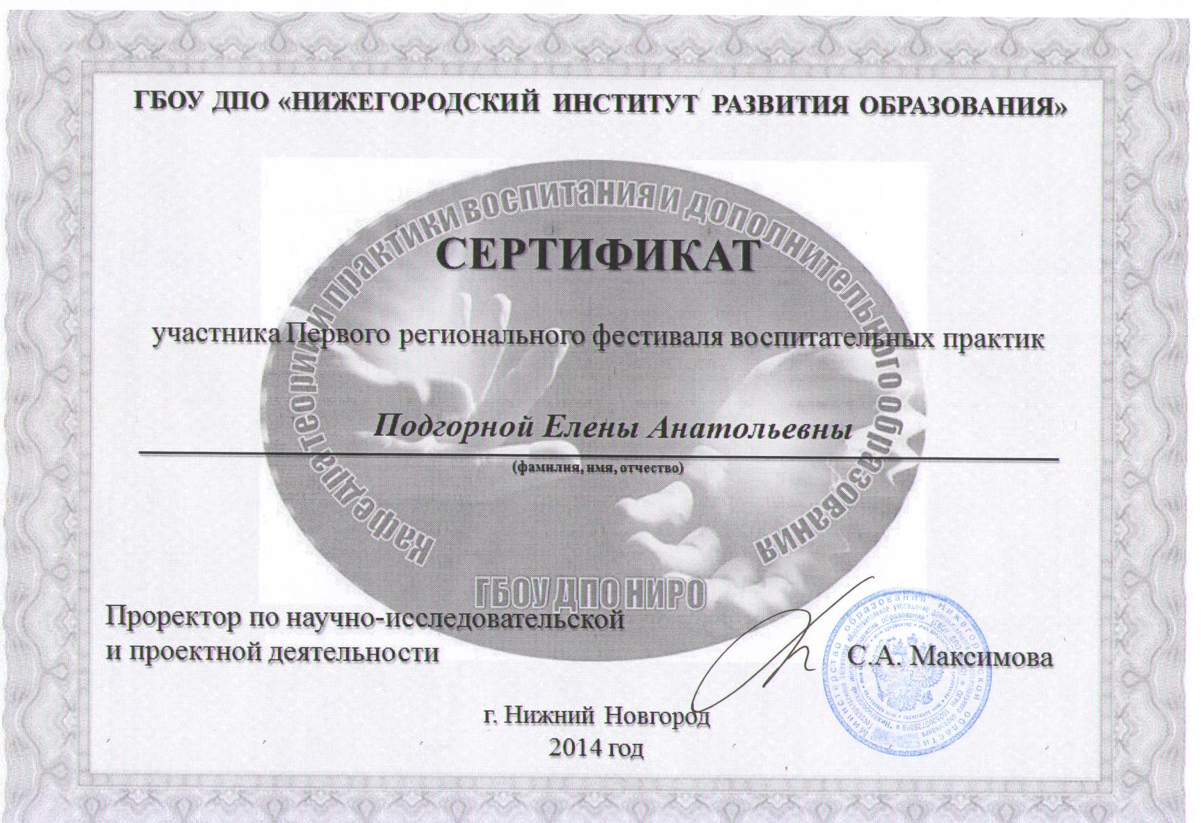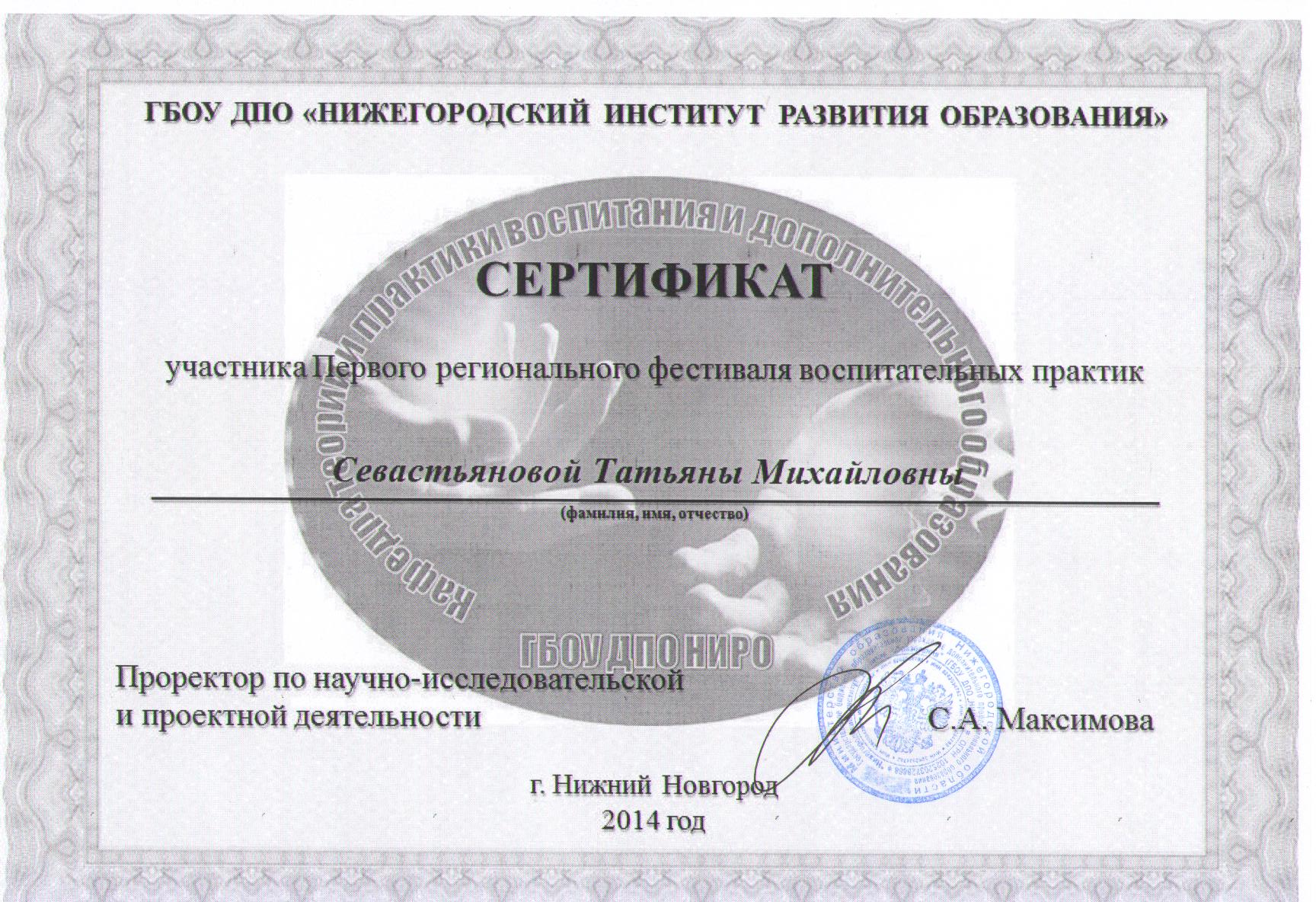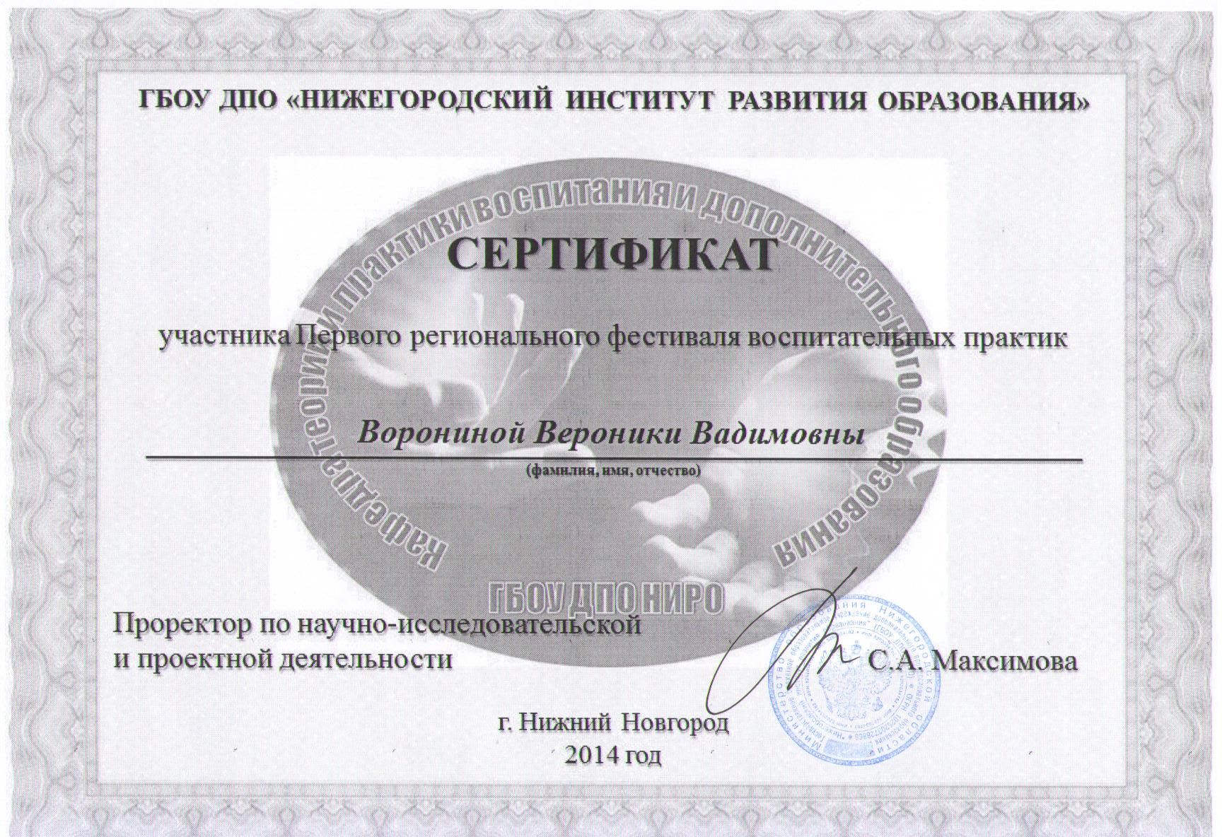 - Благодарность от департамента образования администрации города Нижнего Новгорода