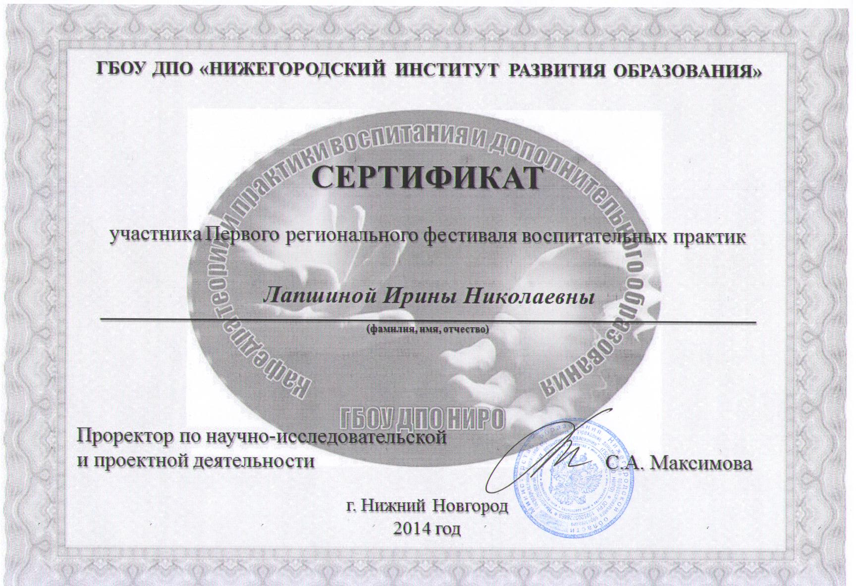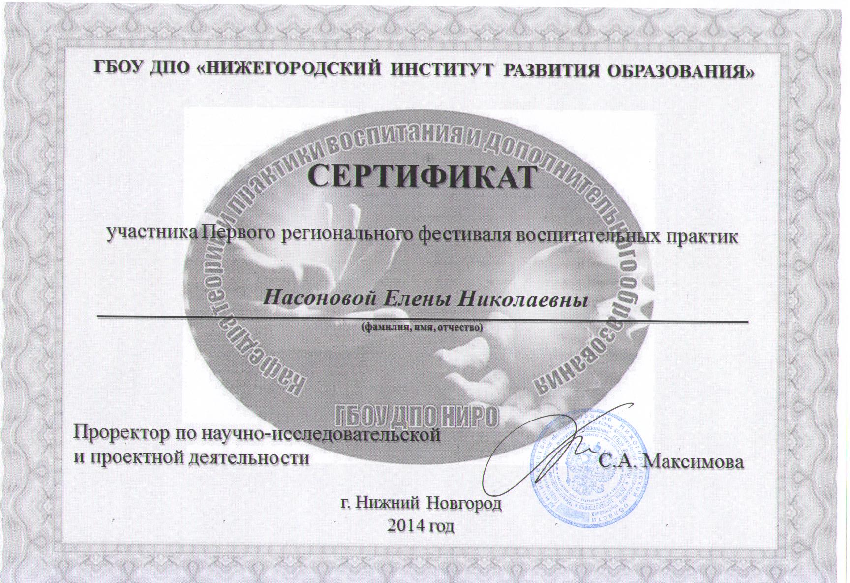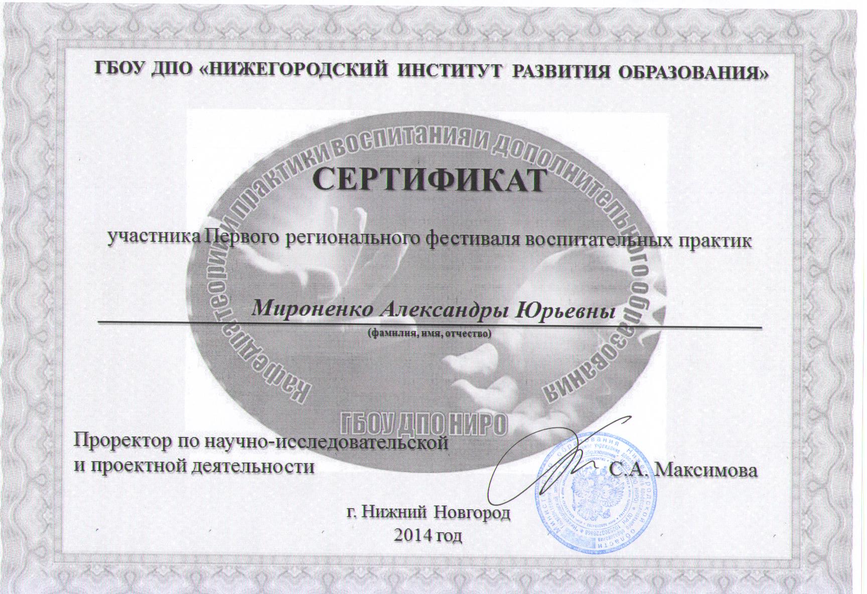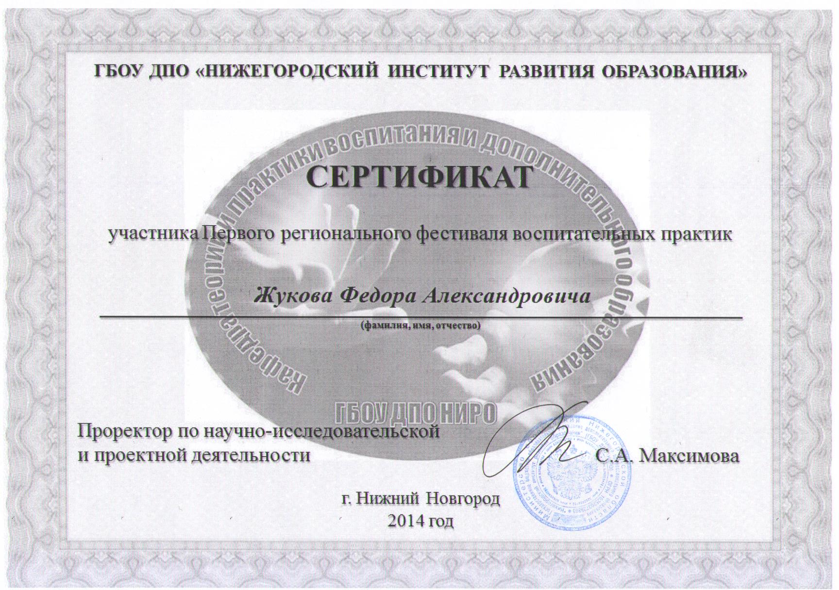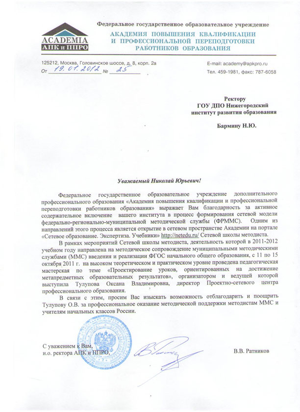 - Благодарность от департамента образования администрации города Нижнего Новгорода