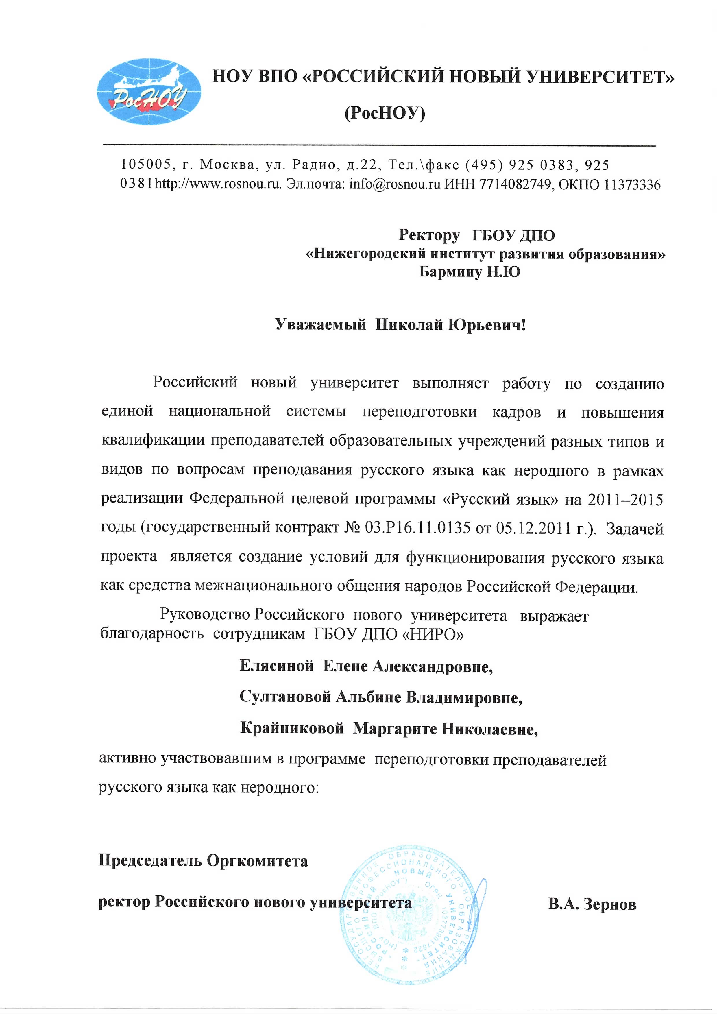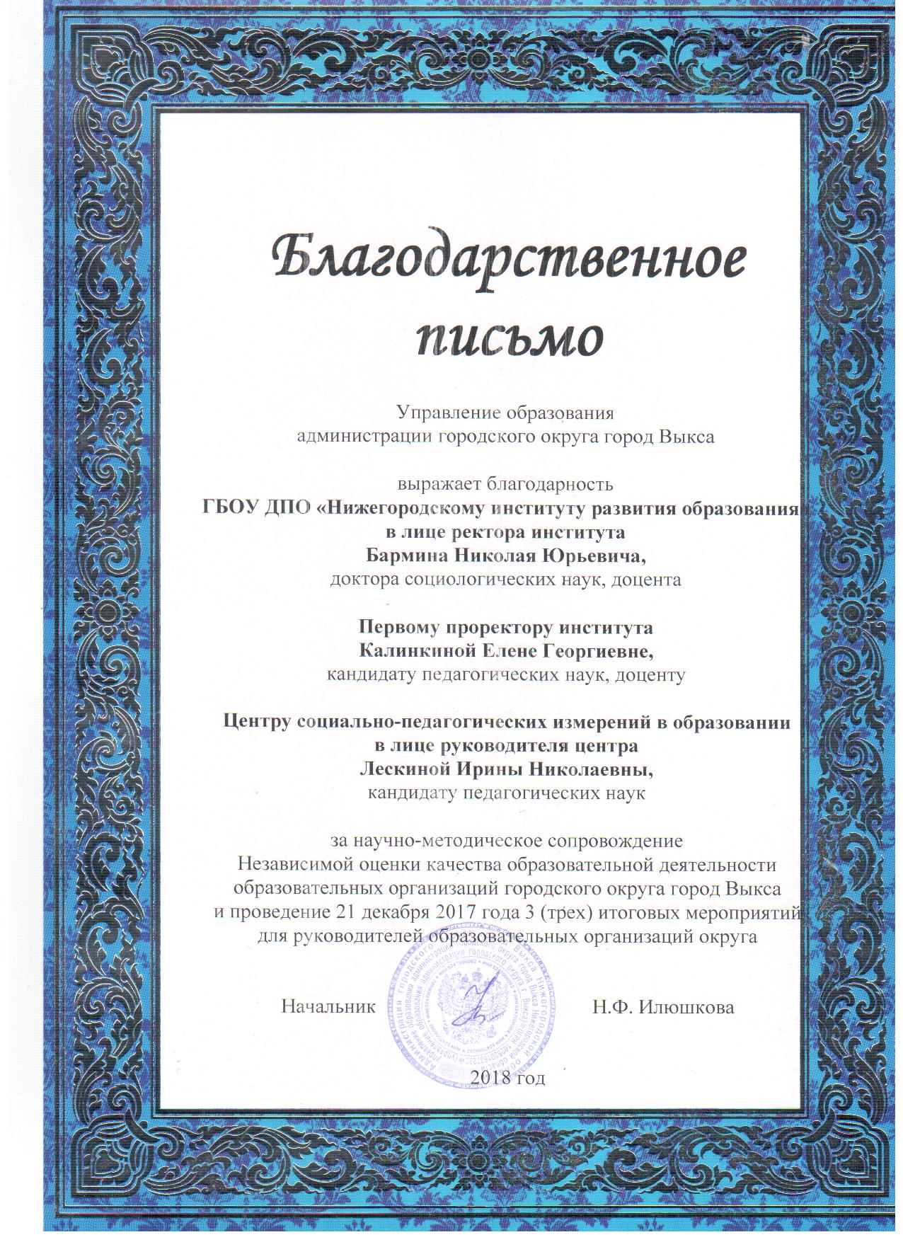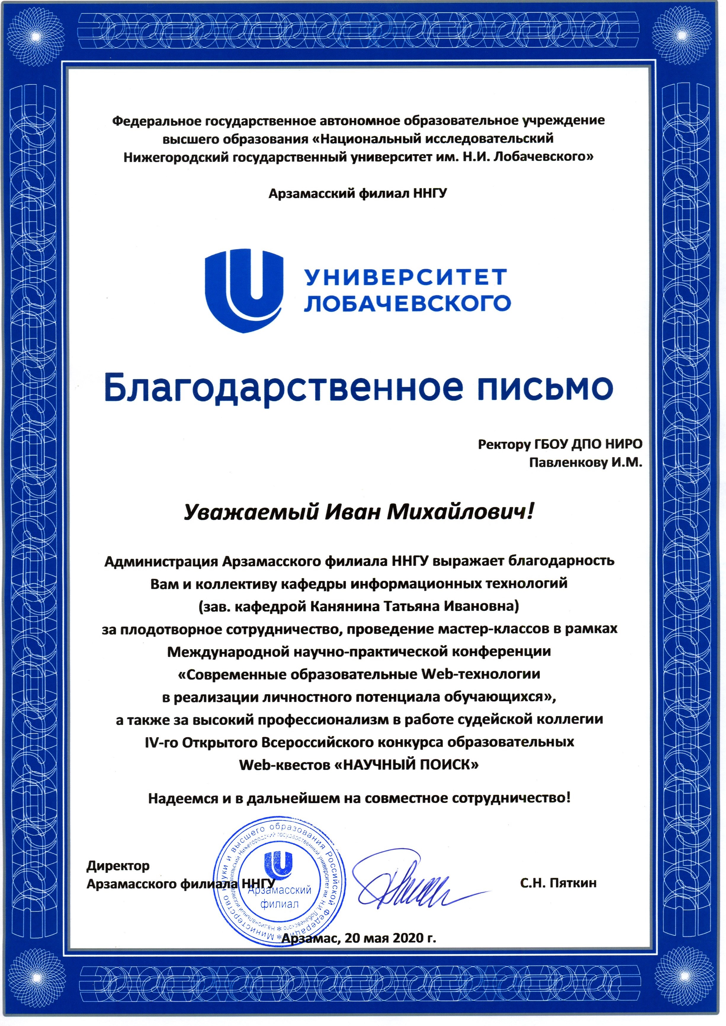 - Благодарственное письмо от ФГАОУ ВО "Национальный исследовательский Нижегородский государственный университет им. Н.И. Лобачевского" Арзамасский филиал ННГУ