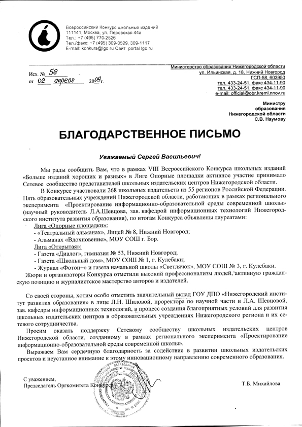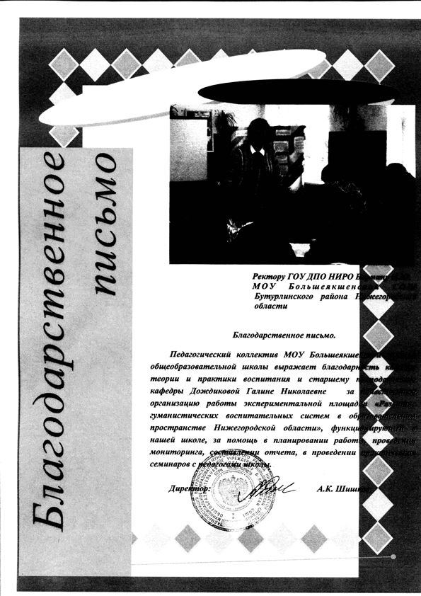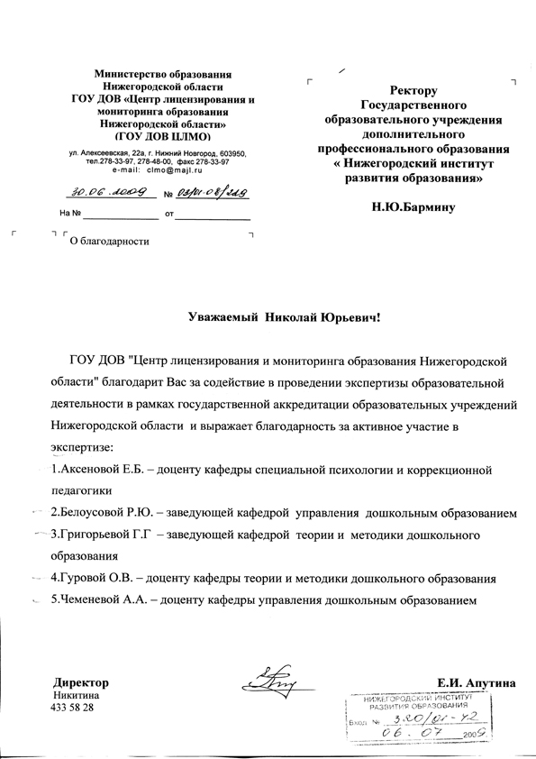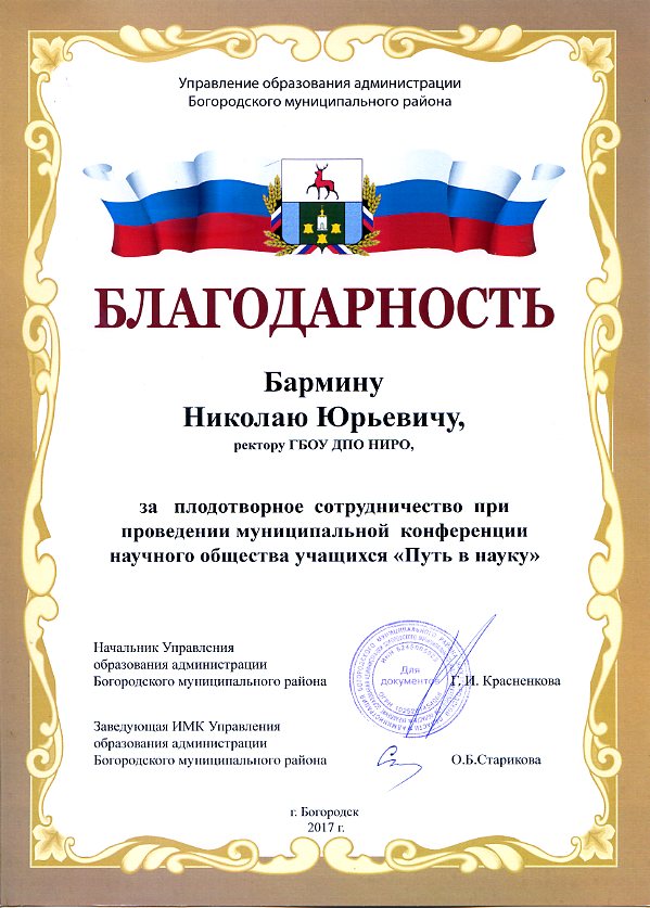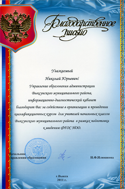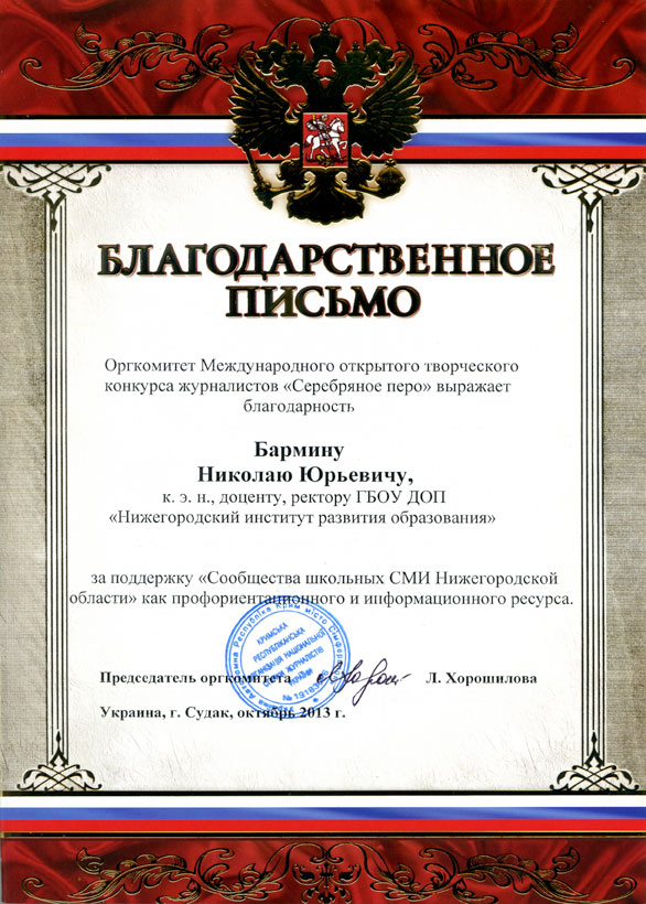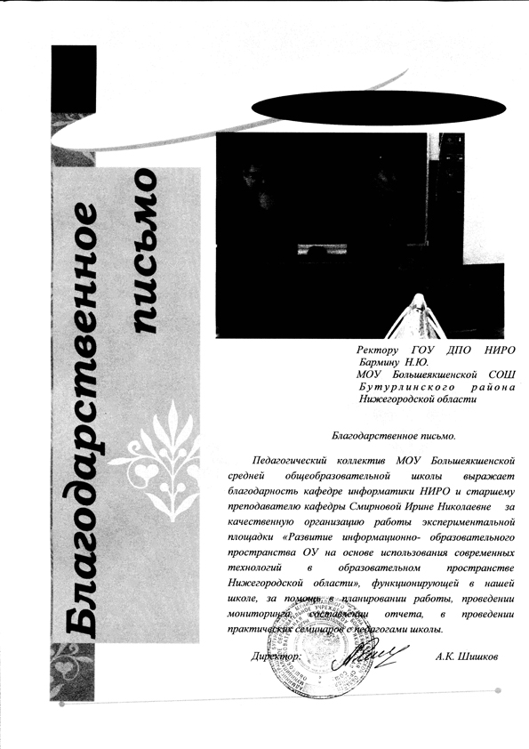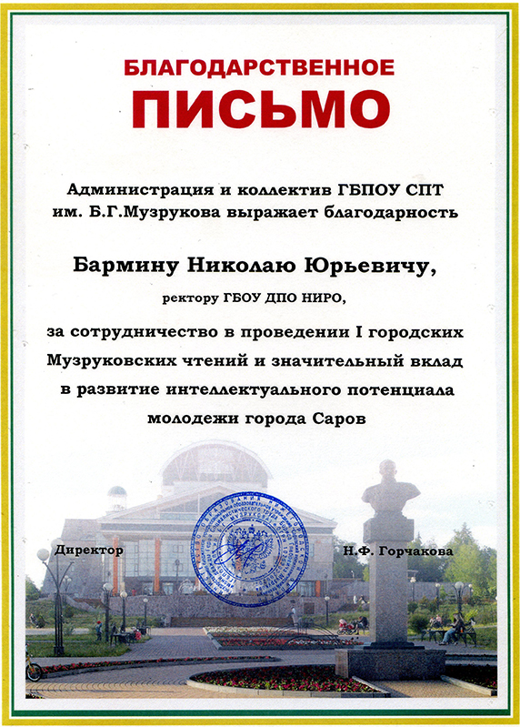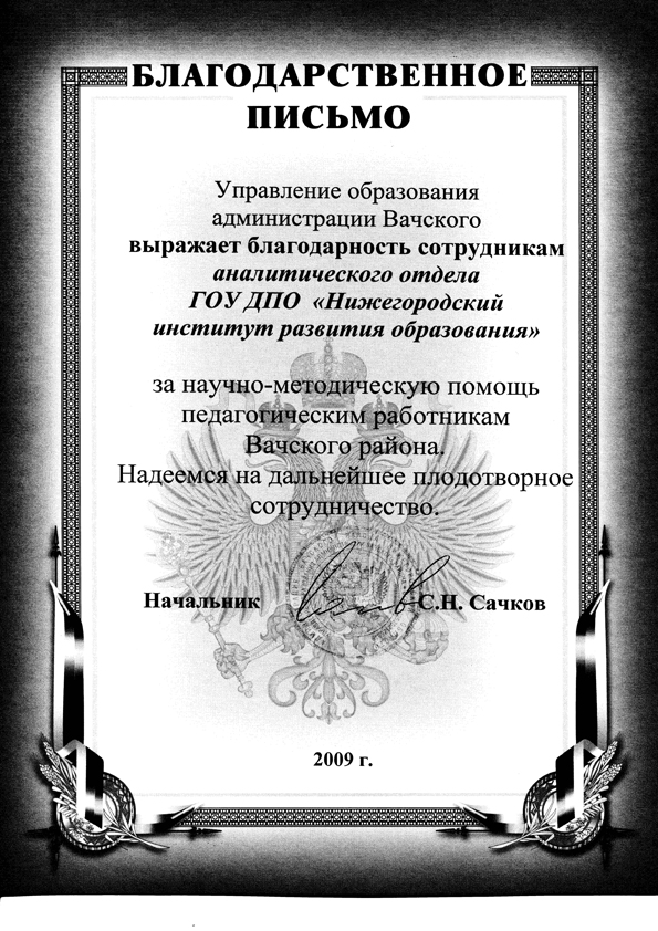 - Благодарность от заместителя министра образования Нижегородской области В. Г. Шахнозарова