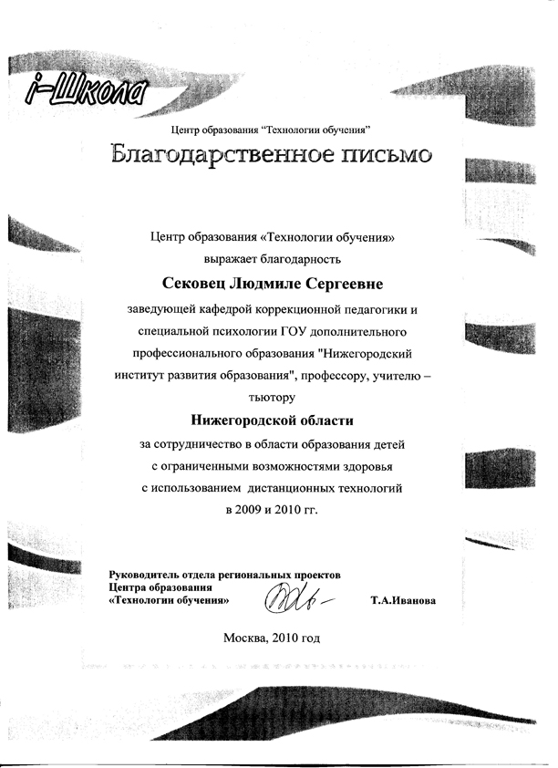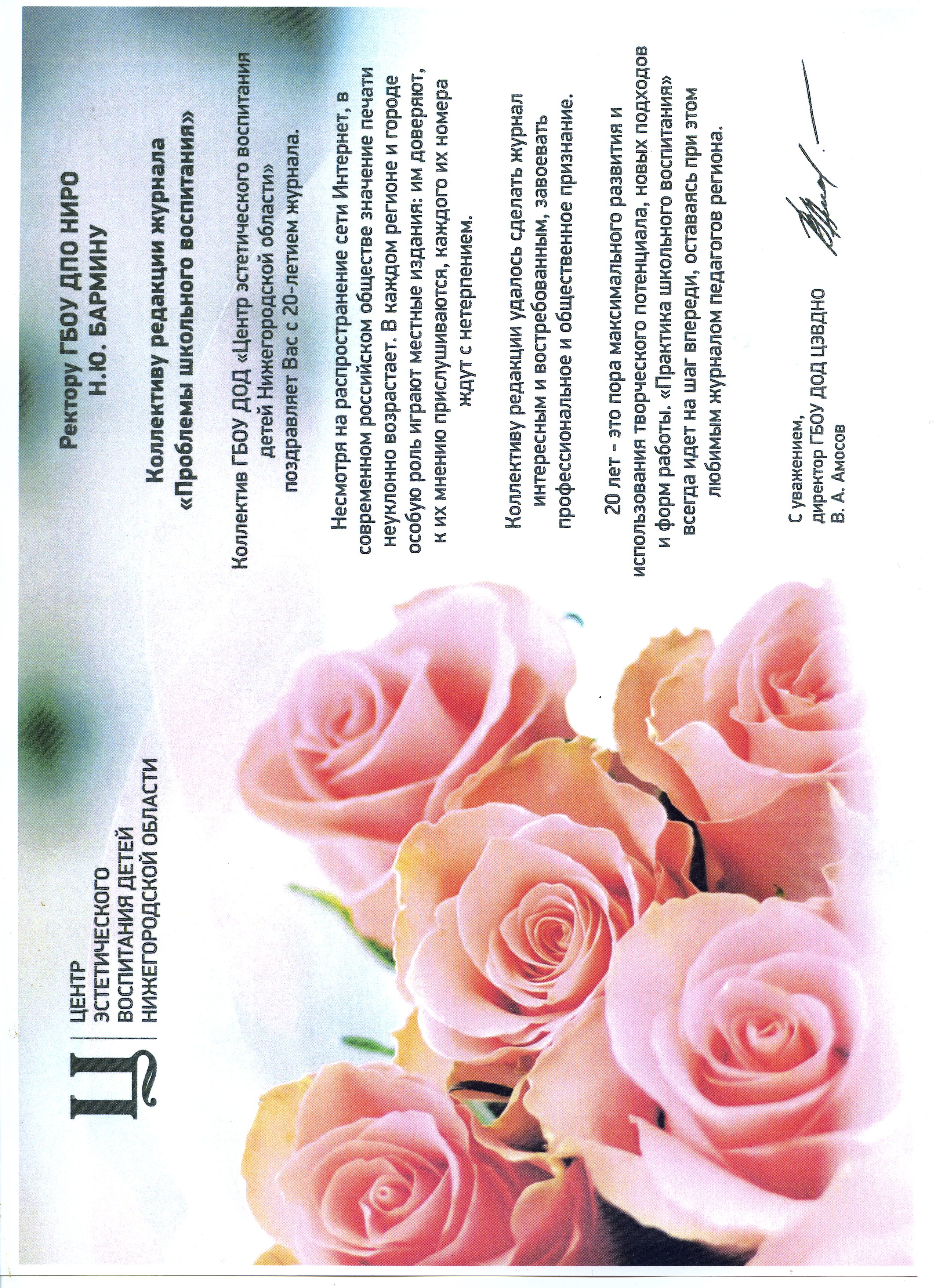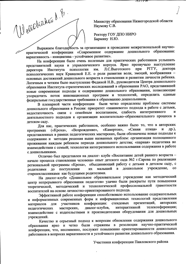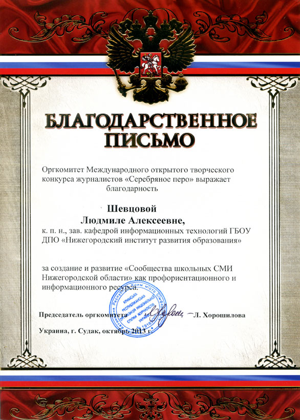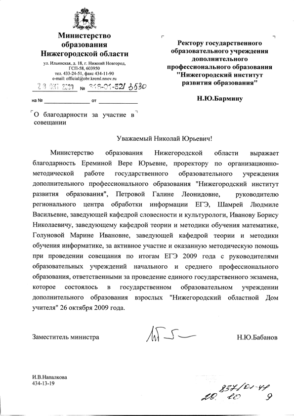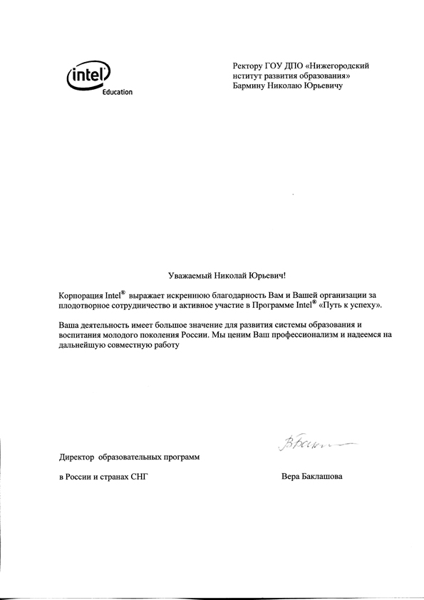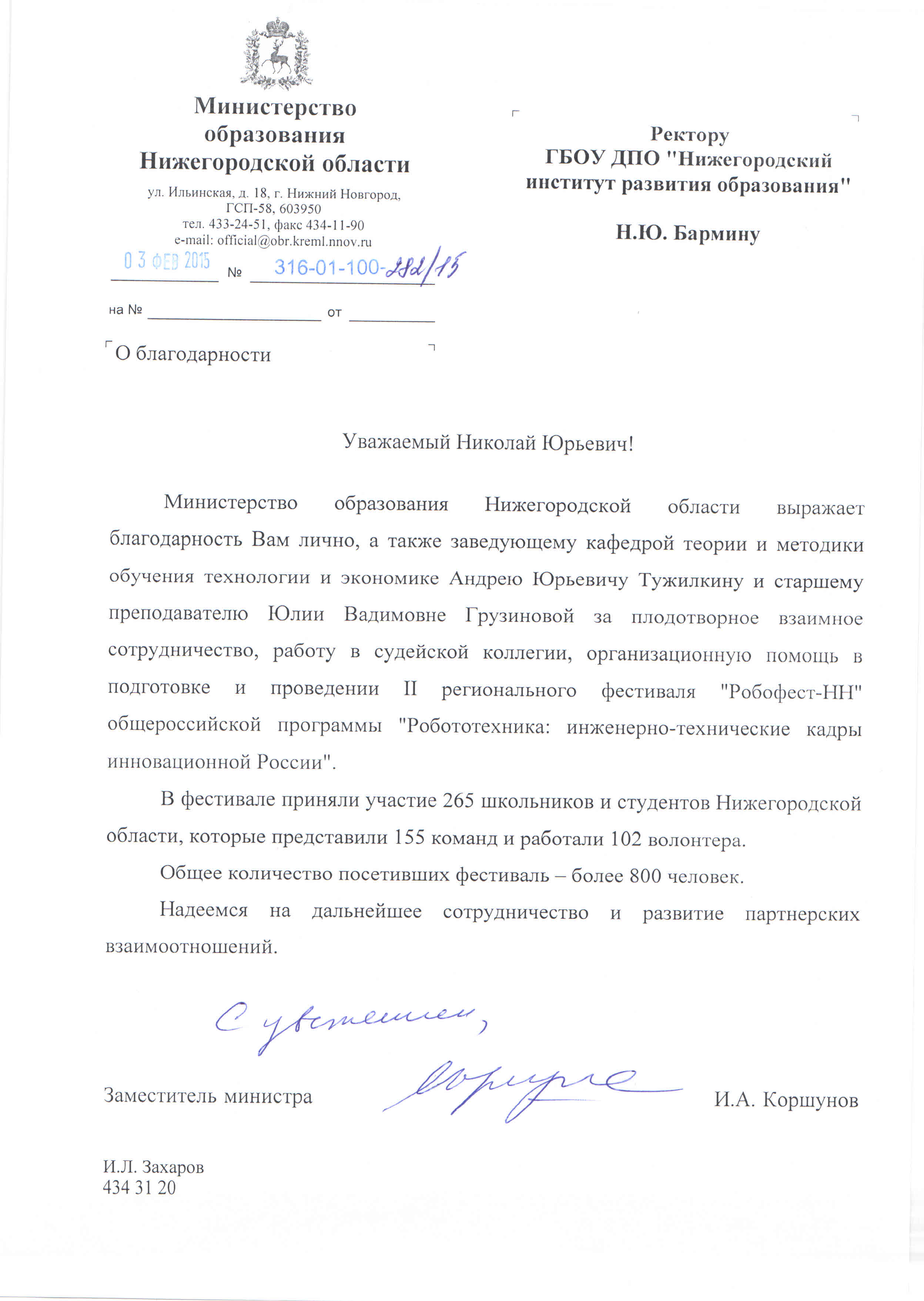 - Благодарность от заместителя министра образования Нижегородской области В. Г. Шахнозарова