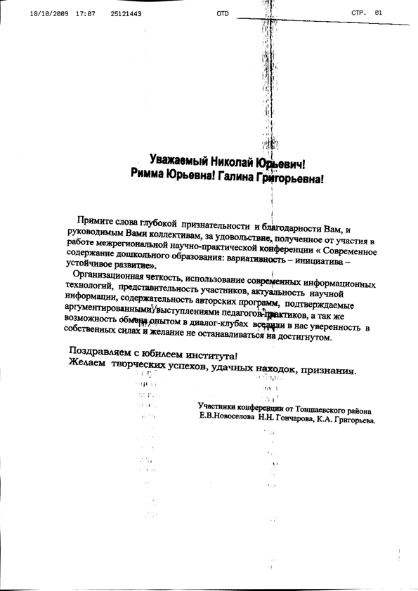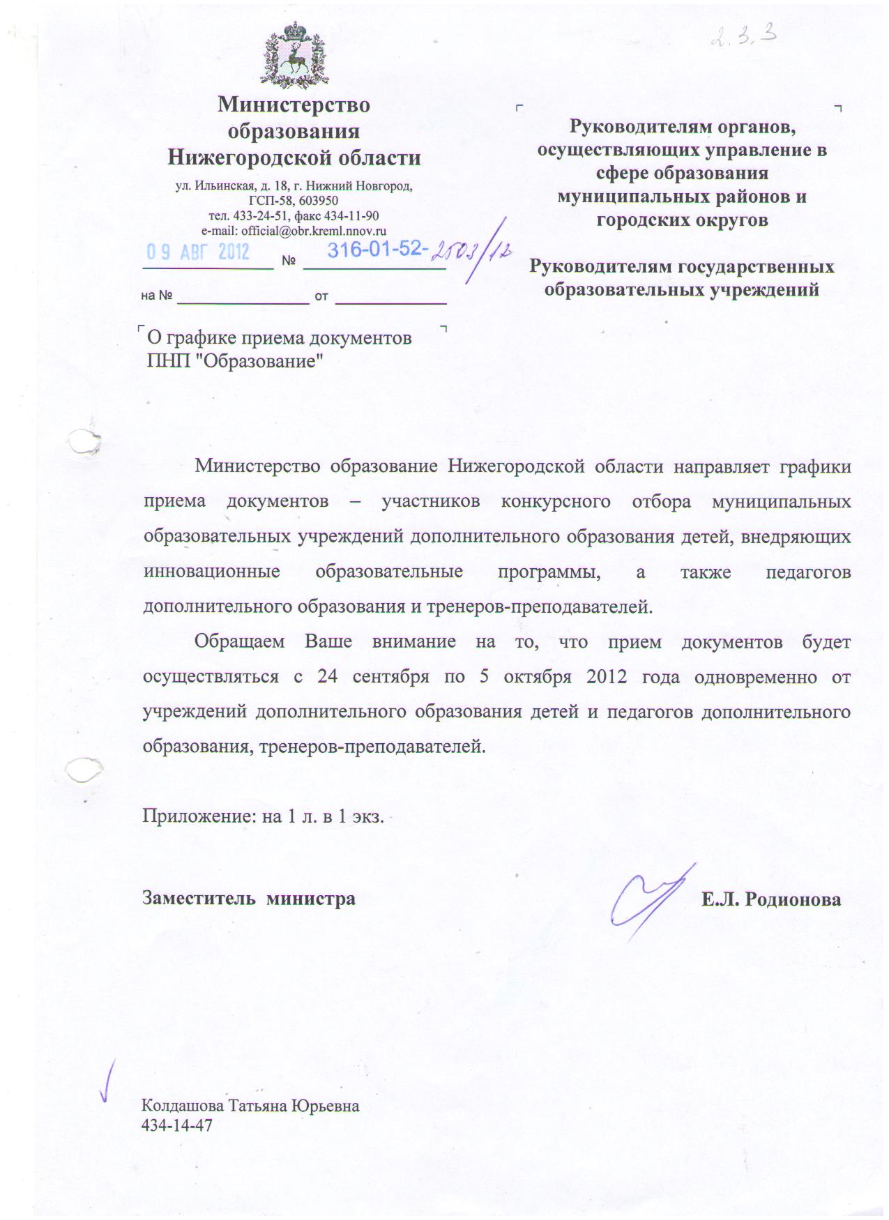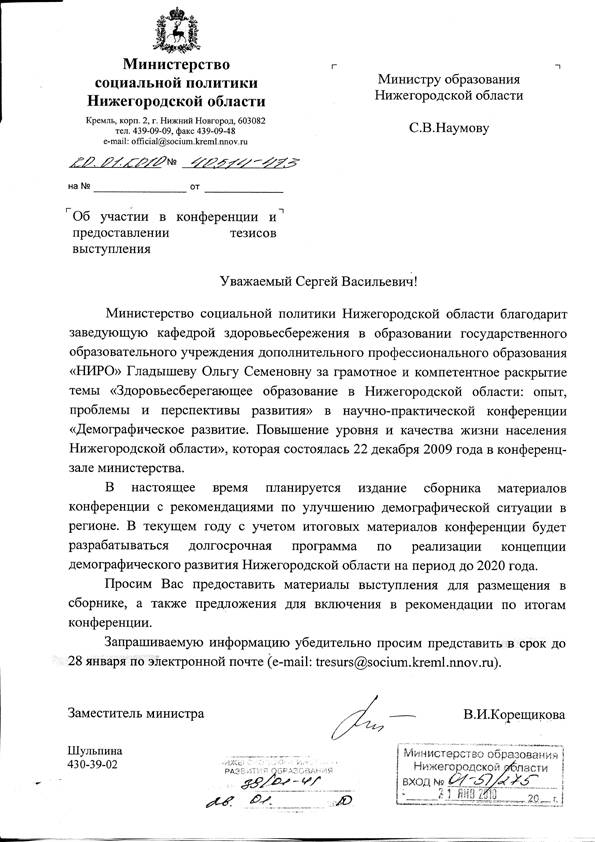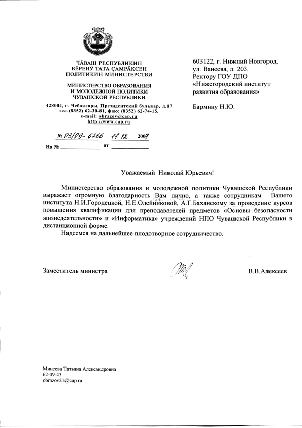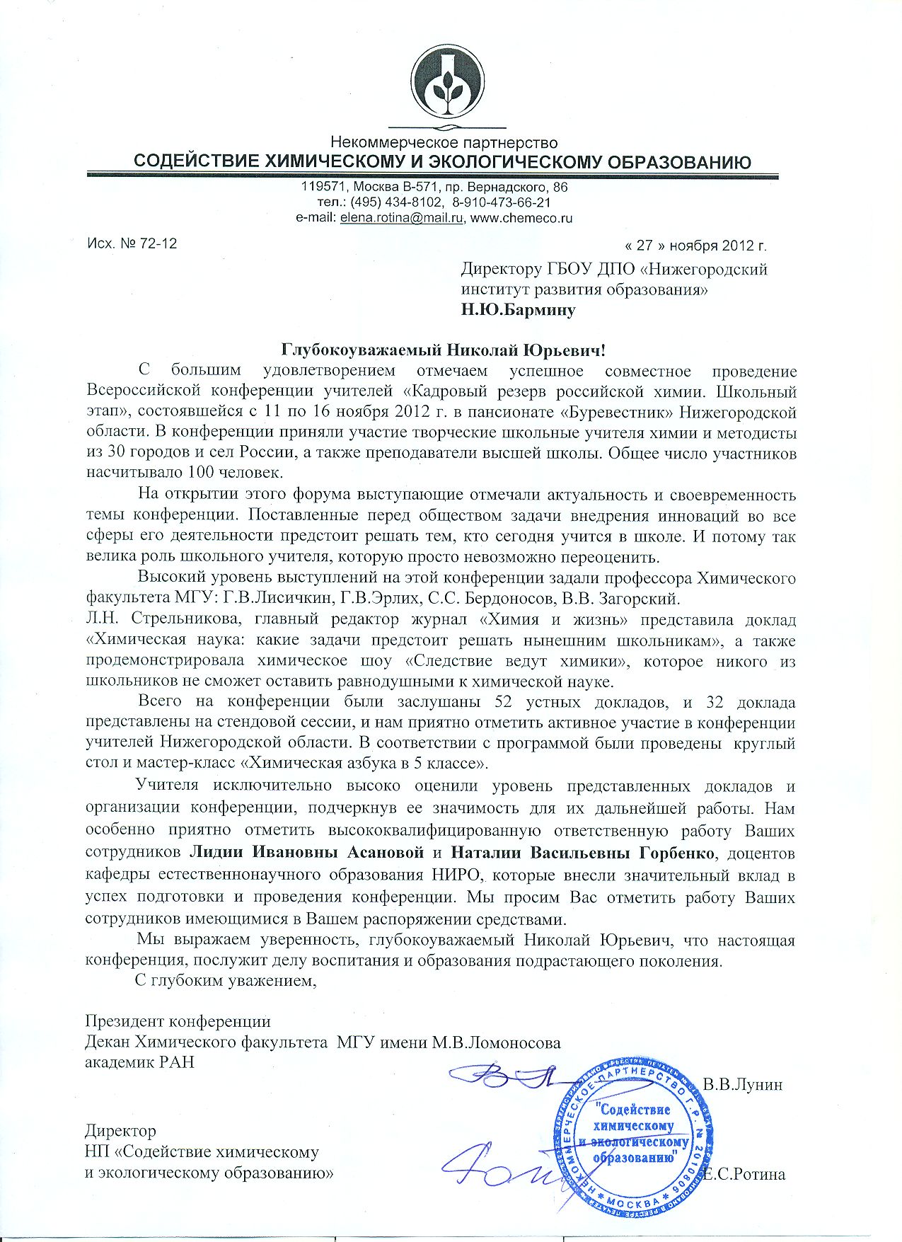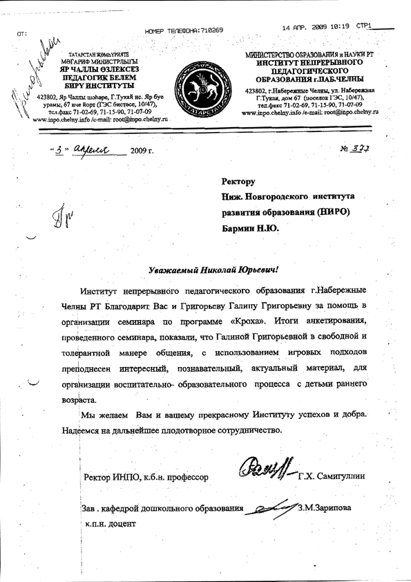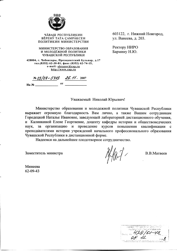 - Благодарность от заместителя министра образования Нижегородской области В. Г. Шахнозарова