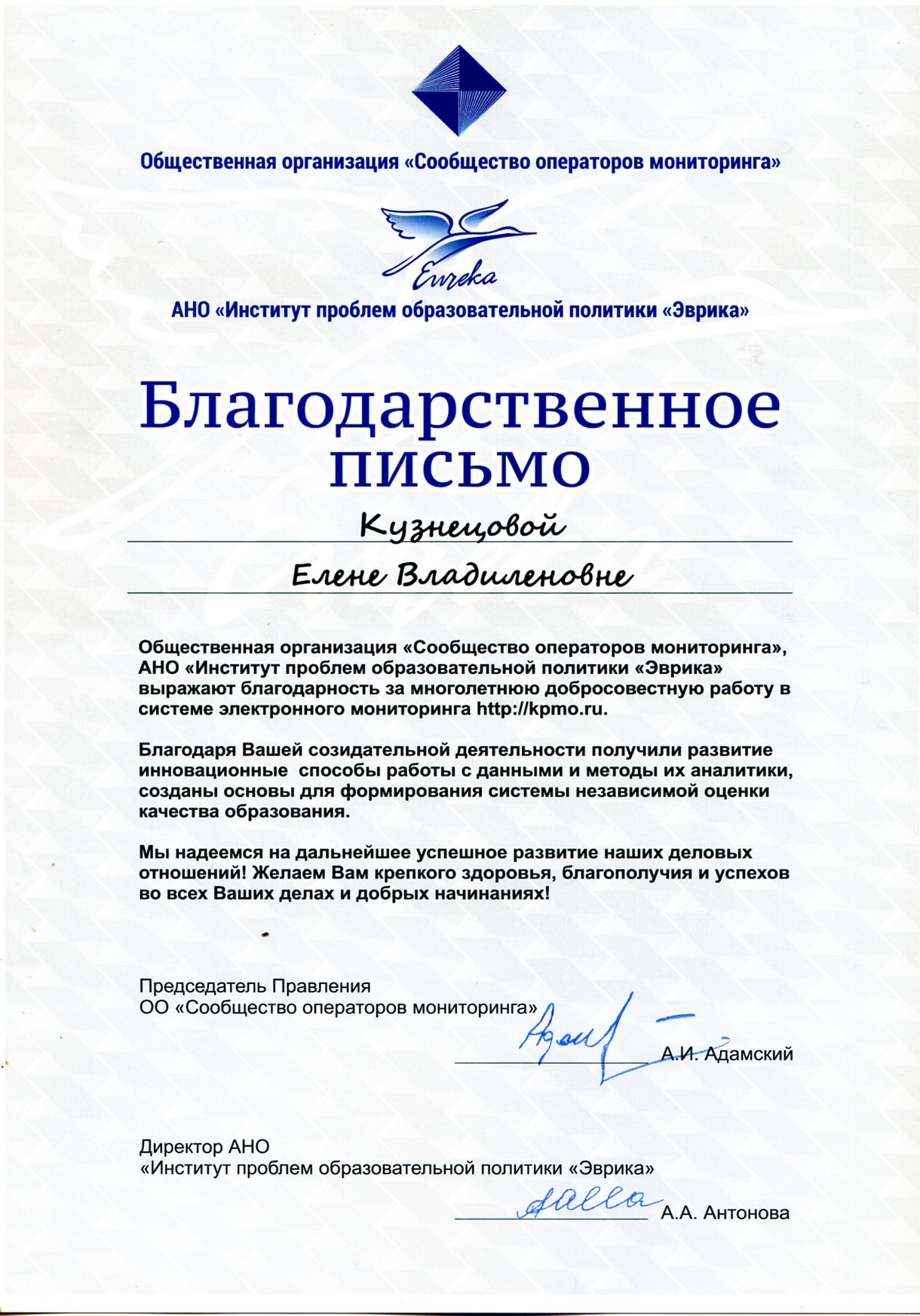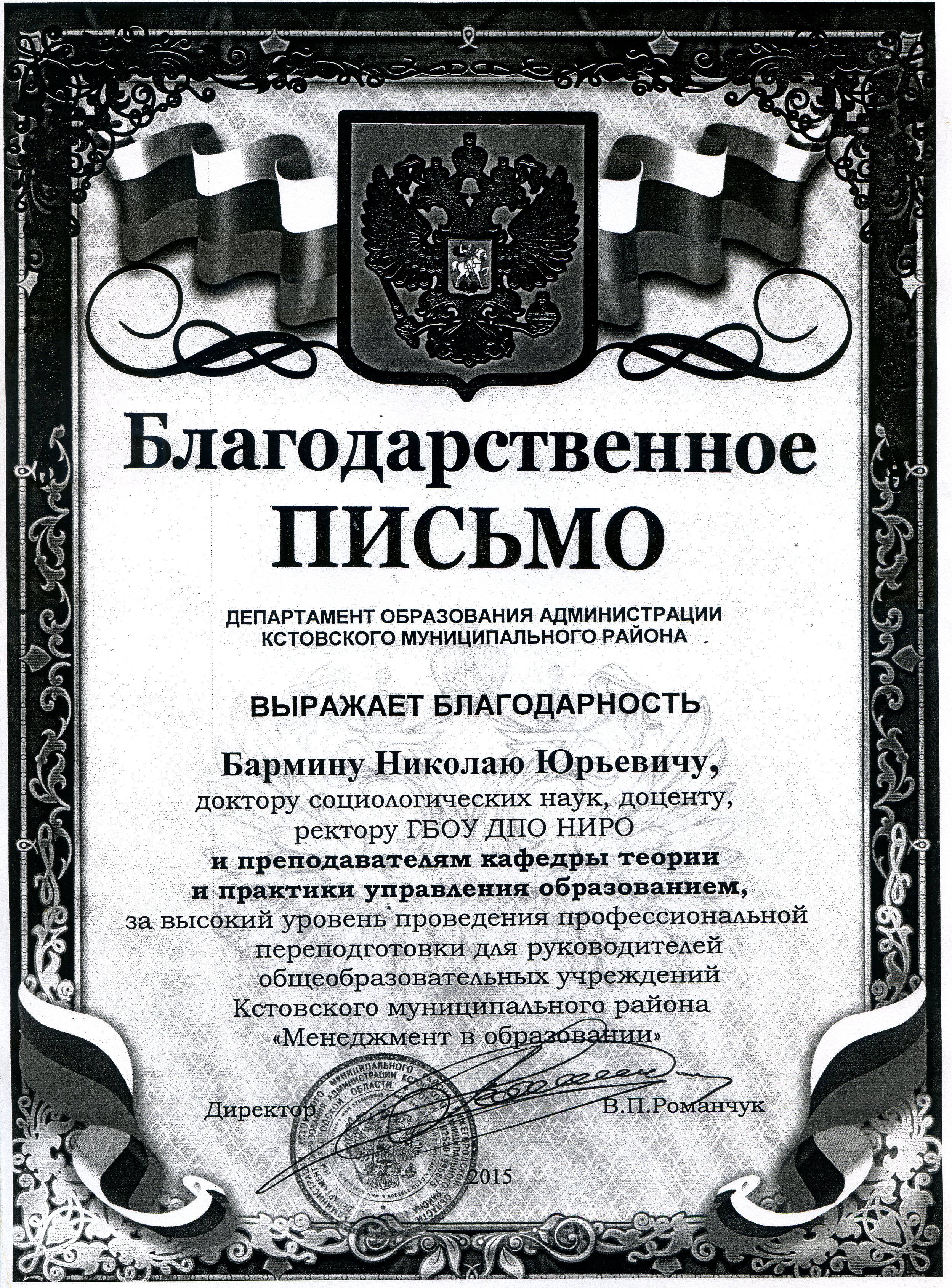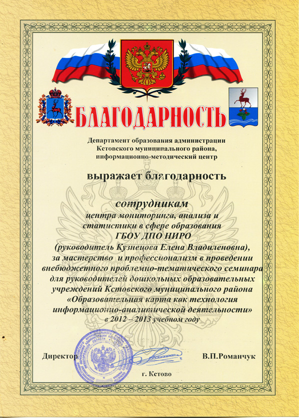 - Благодарность от департамента образования администрации Кстовского муниципального района