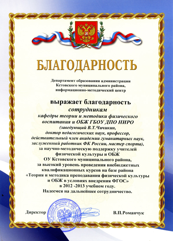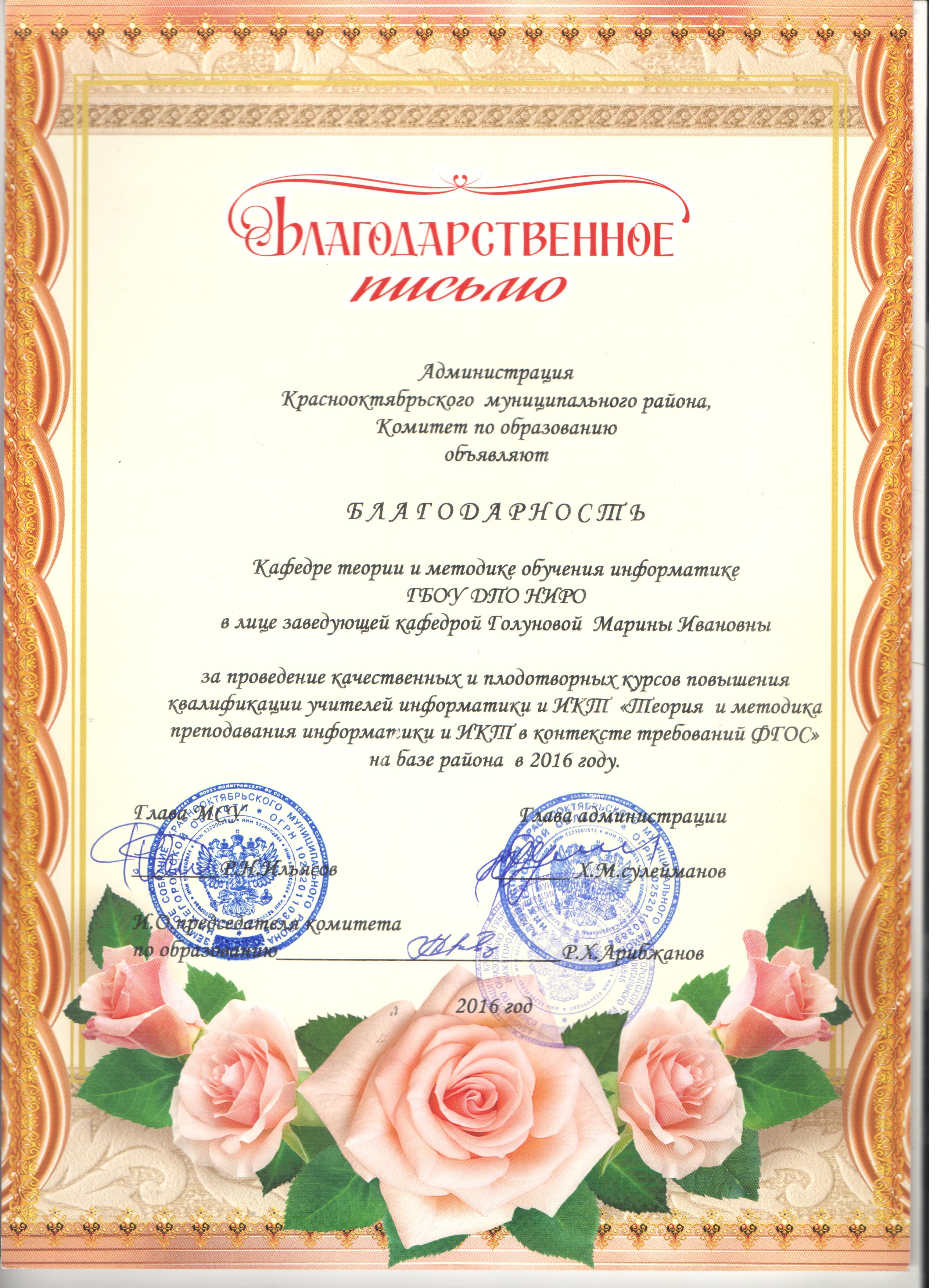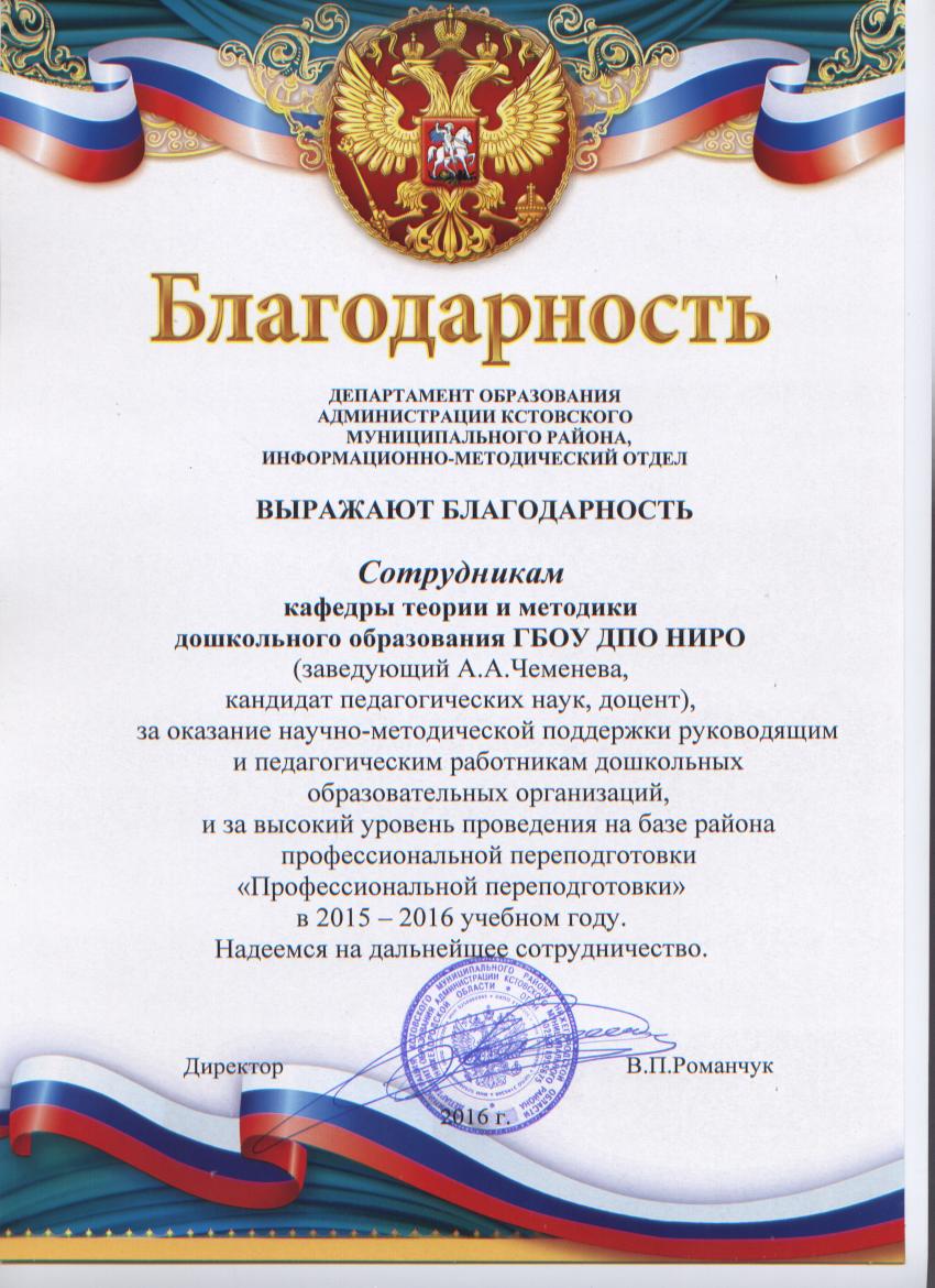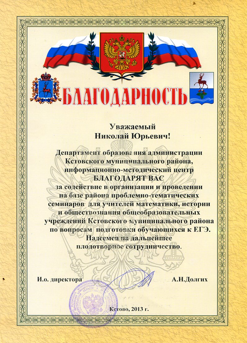 - Благодарность от департамента образования администрации Кстовского муниципального района