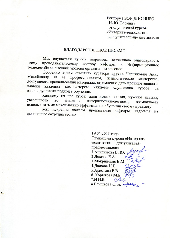 - Благодарность от слушателей курса профессиональной подготовки «Дошкольное образование»