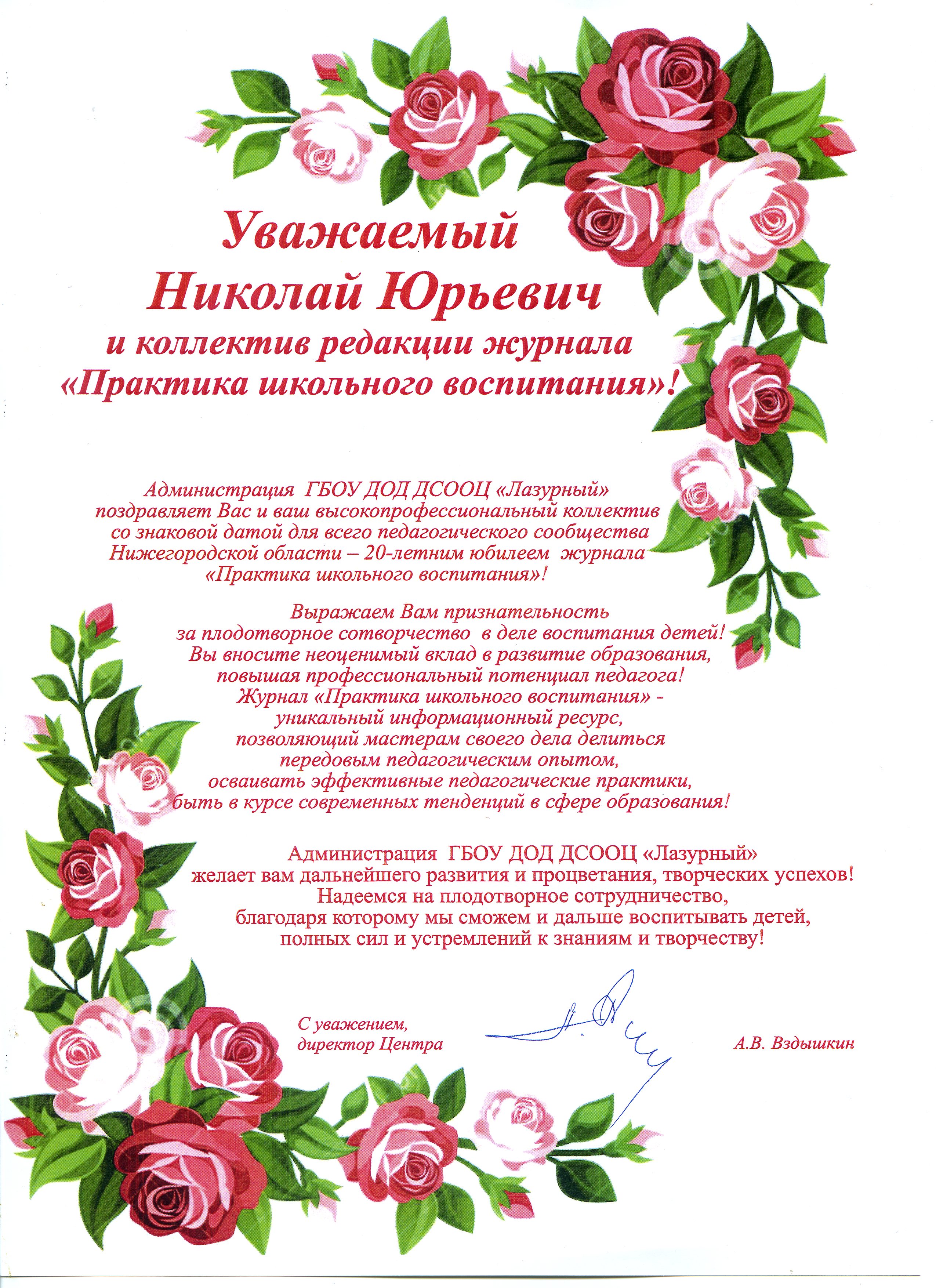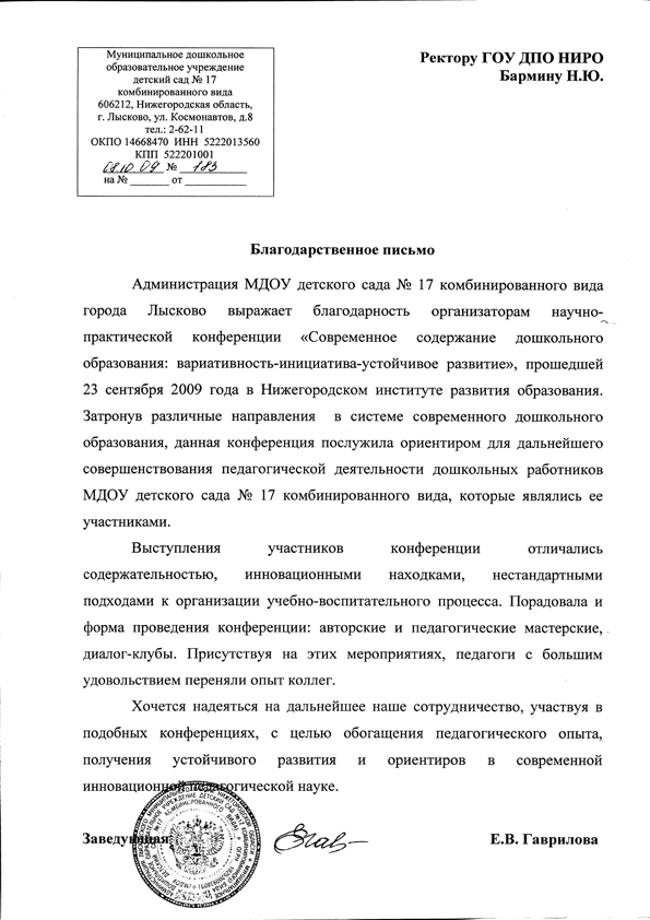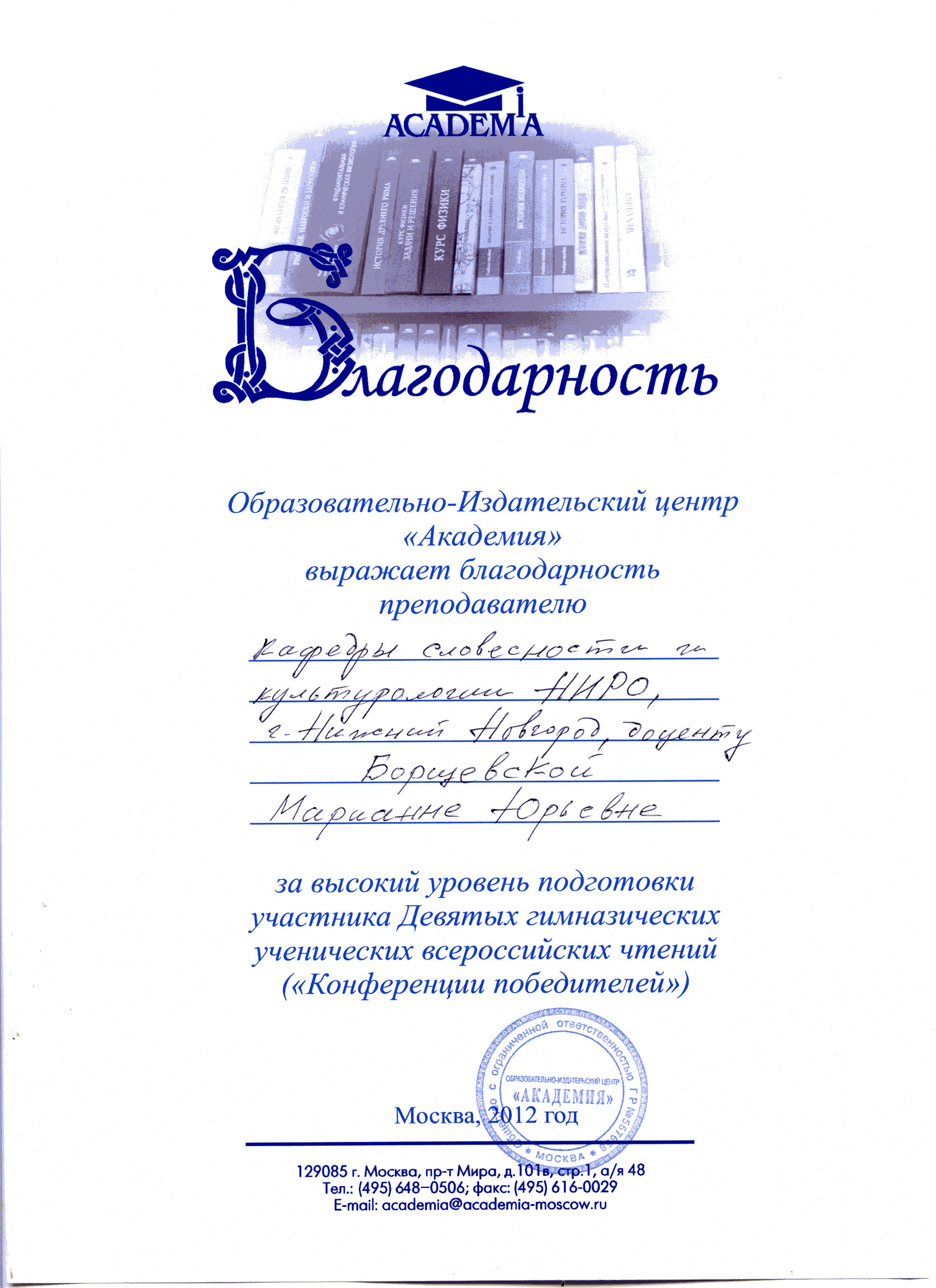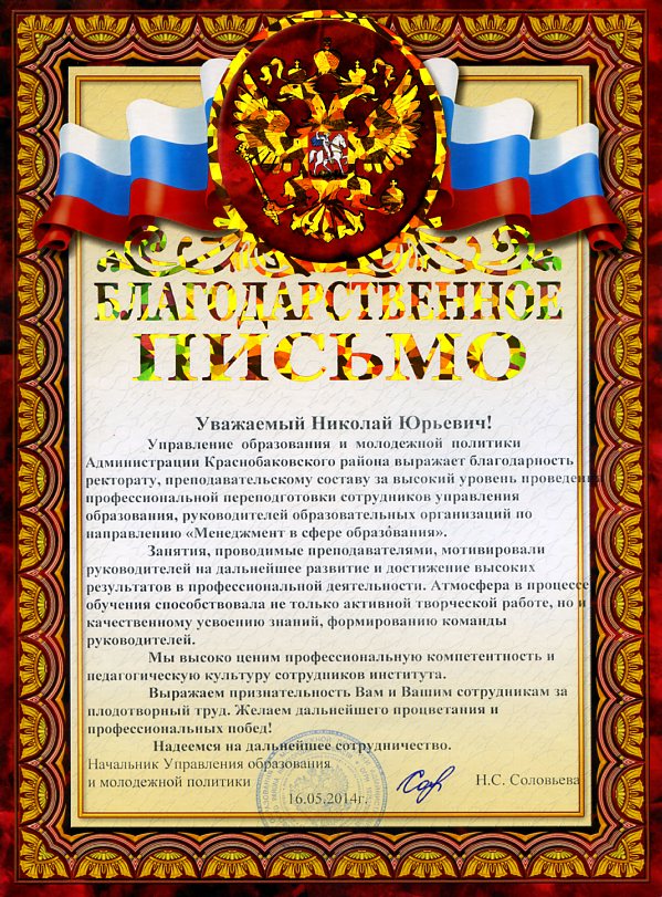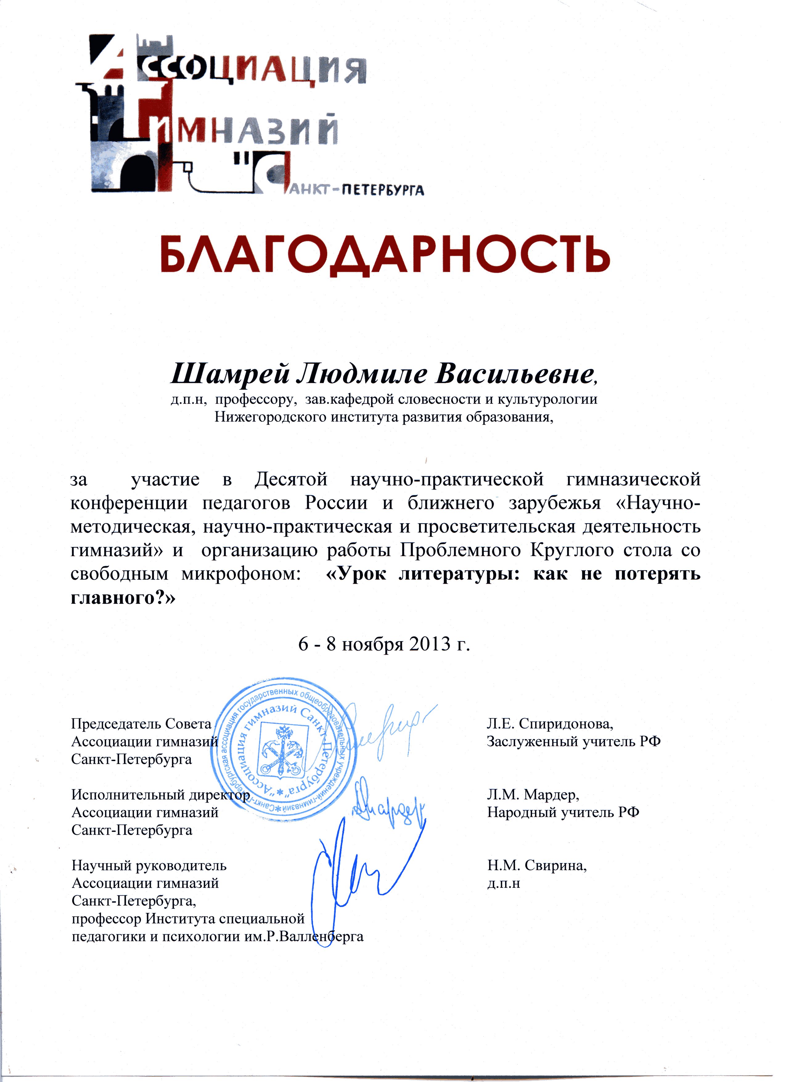 - Благодарность от администрации и педагогического коллектива МБОУ "Гимназии" г. Арзамаса