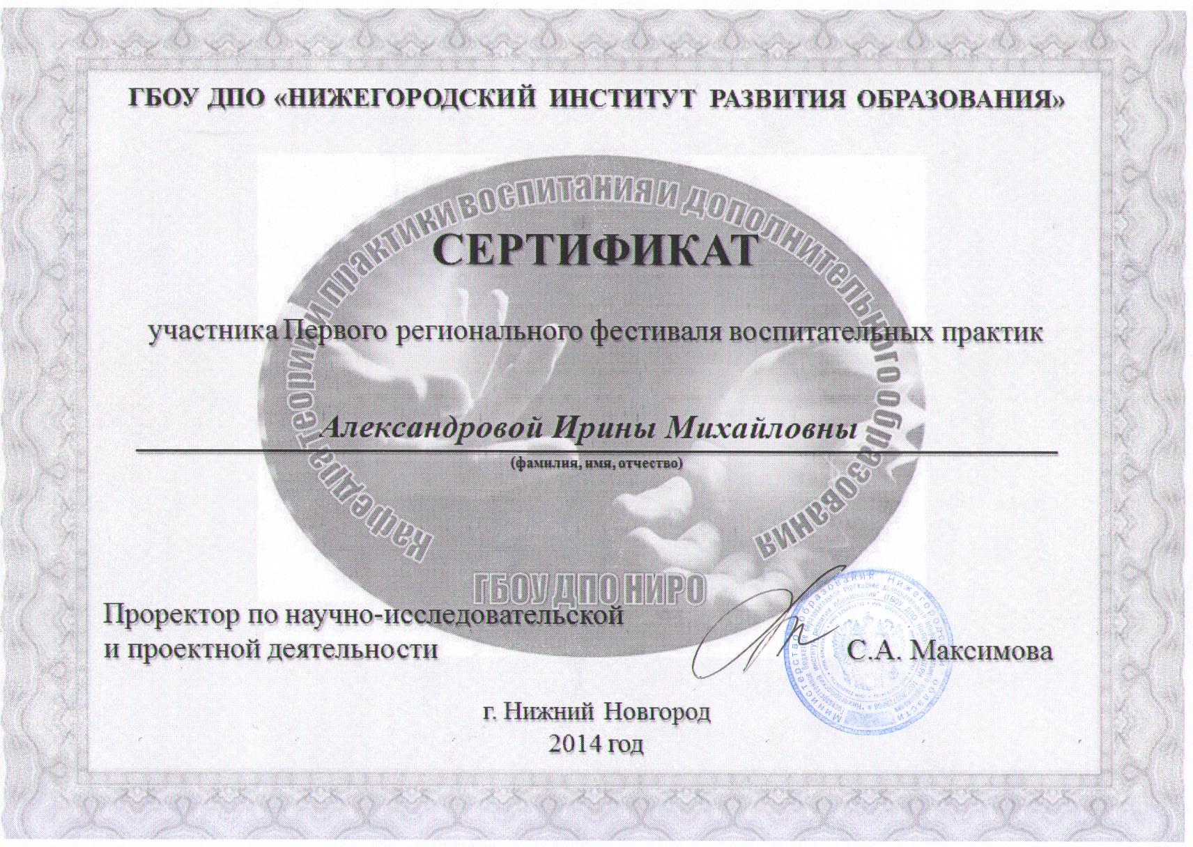 - Благодарность от Управления образования администрации Приокского района г. Нижнего Новгорода