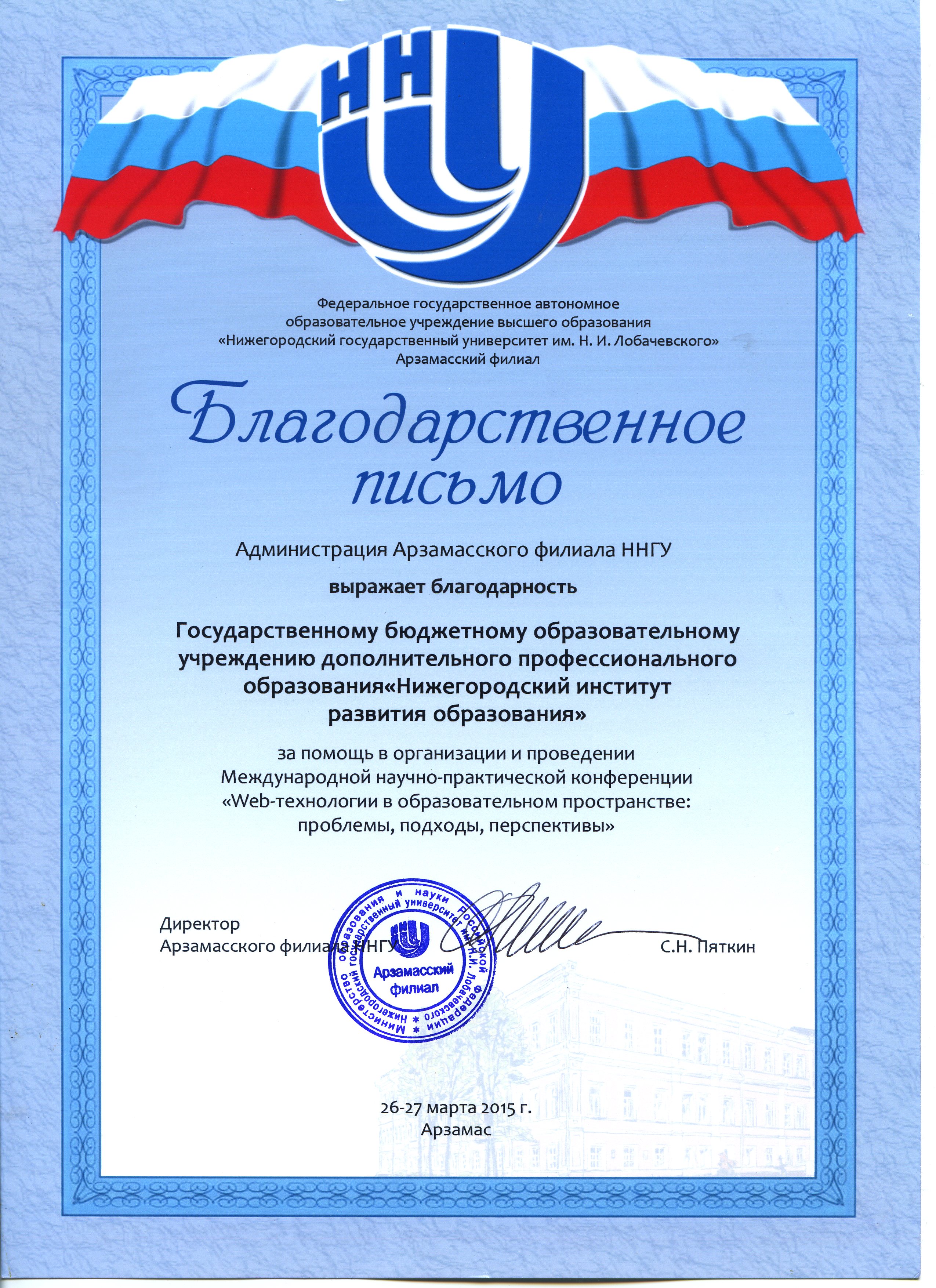 - Благодарность от директора Арзамасского филиала ННГУ С. Н. Пяткина