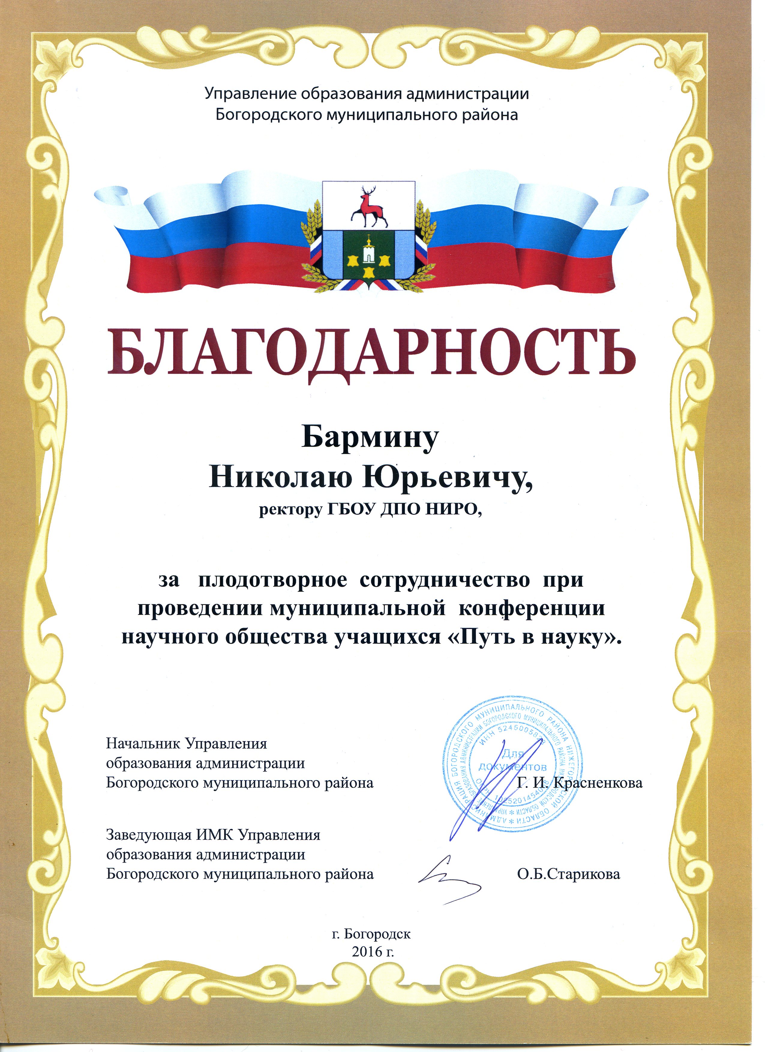 - Благодарность от начальника управления образования администрации Богородского муниципального района