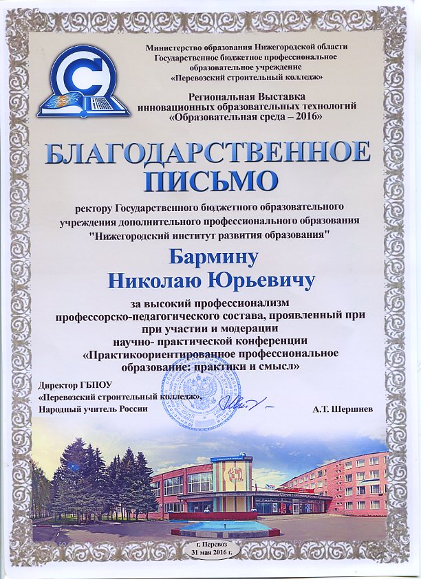 - Благодарность от ГБОУ "Перевозский строительный коледж"