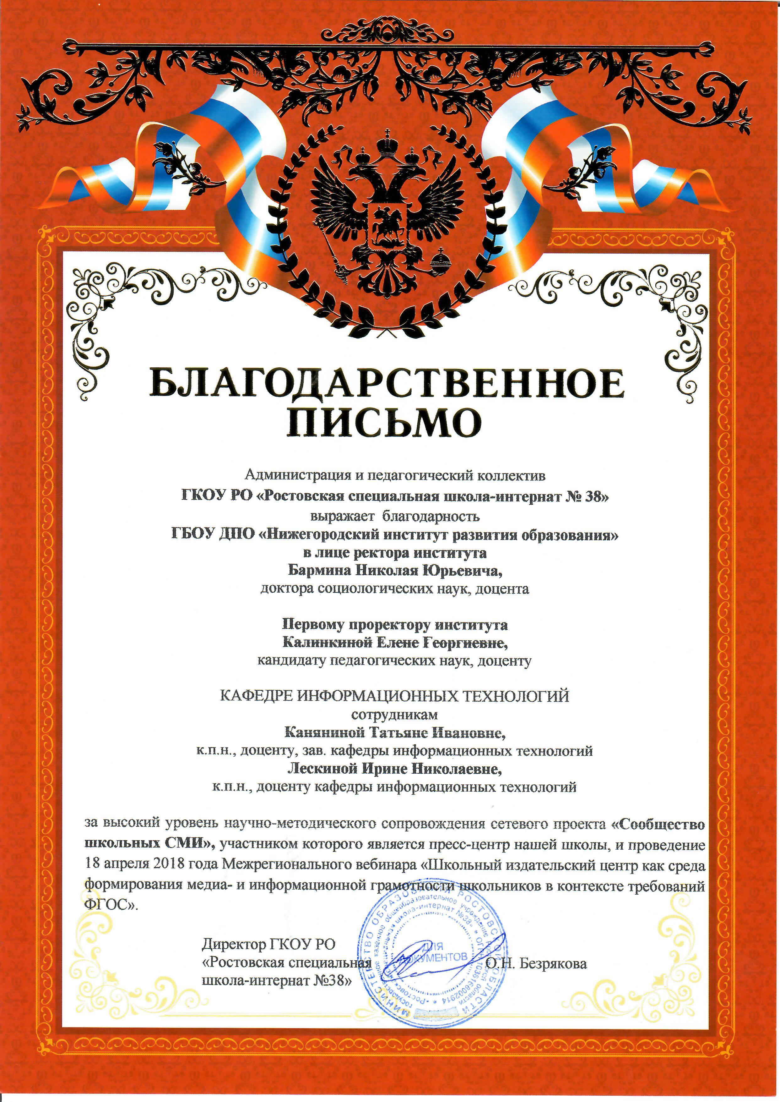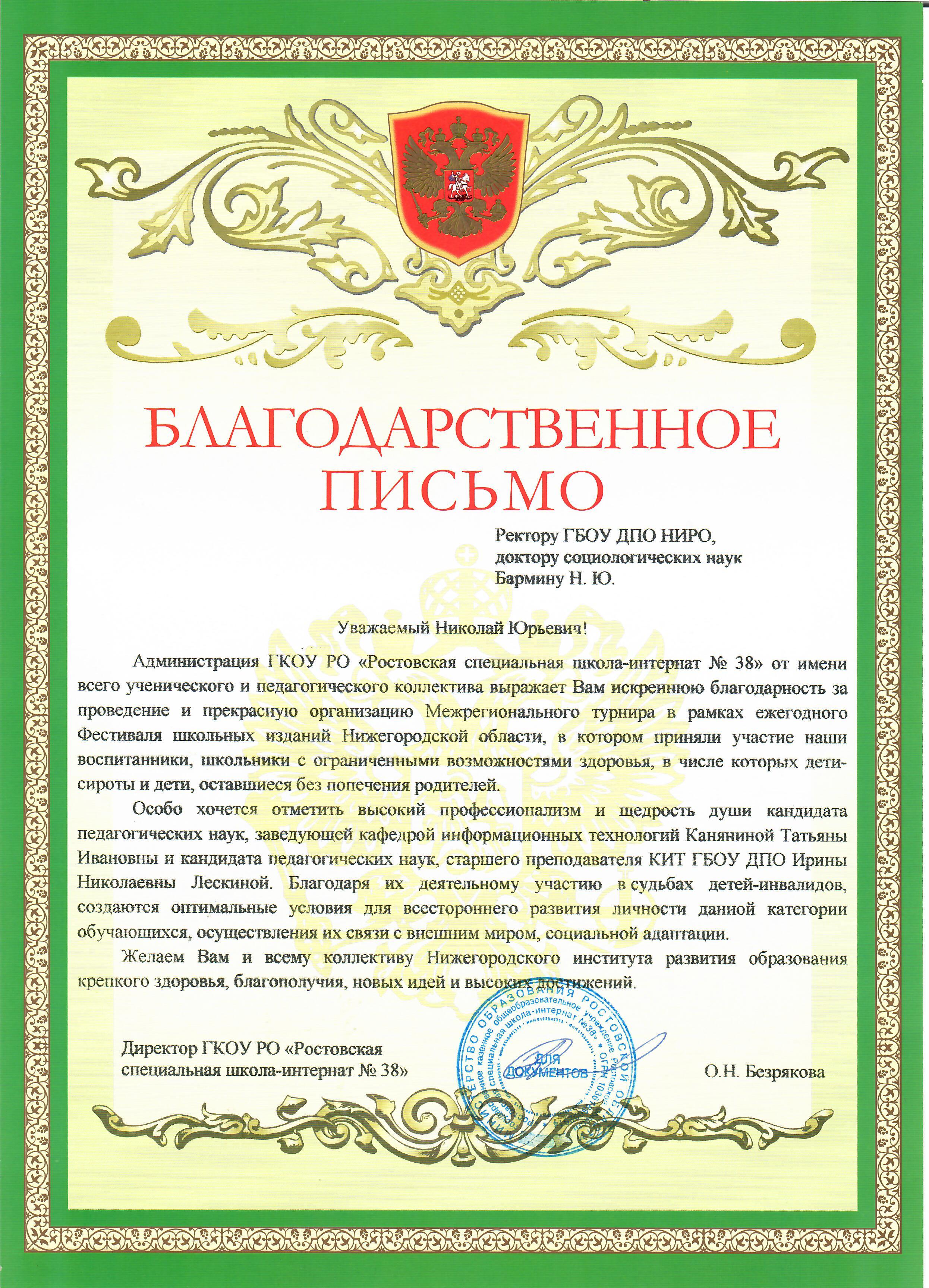 - Благодарность от администрации и педагогического коллектива ГКОУ РО "Ростовская специальная школа-интернат №38"