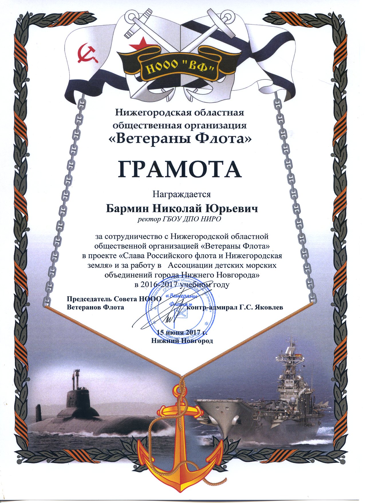 - Грамота от Нижегородской областной общественной организации "Ветераны флота"
