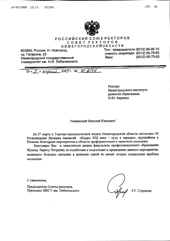 - Благодарность ректору Н. Ю. Бармину от федеральной службы по надзору в сфере образования и науки