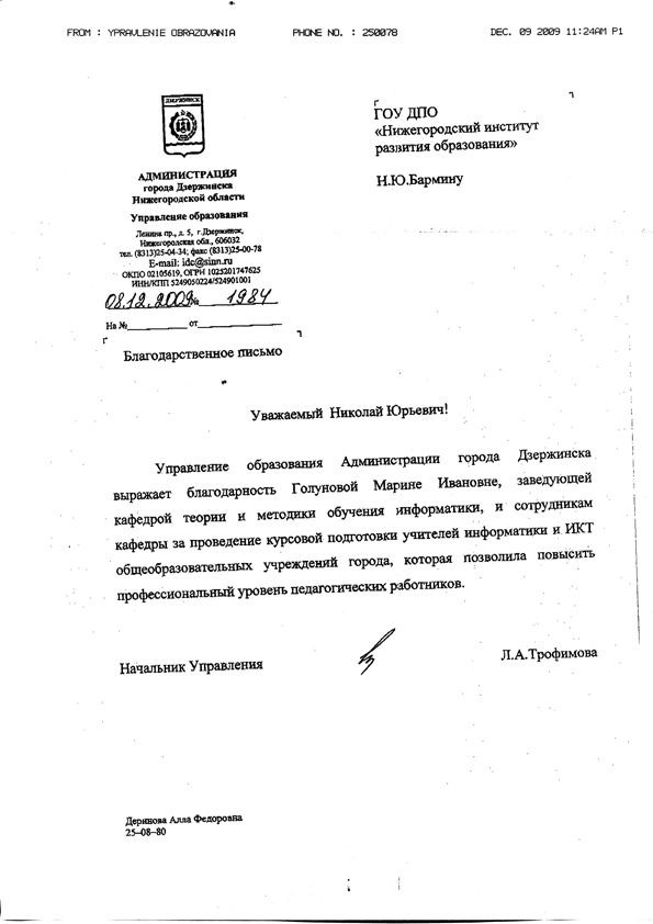 - Благодарность от администрации "Дзержинского индустриально-коммерческого техникума"