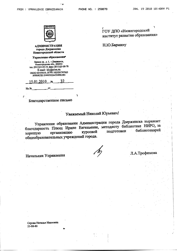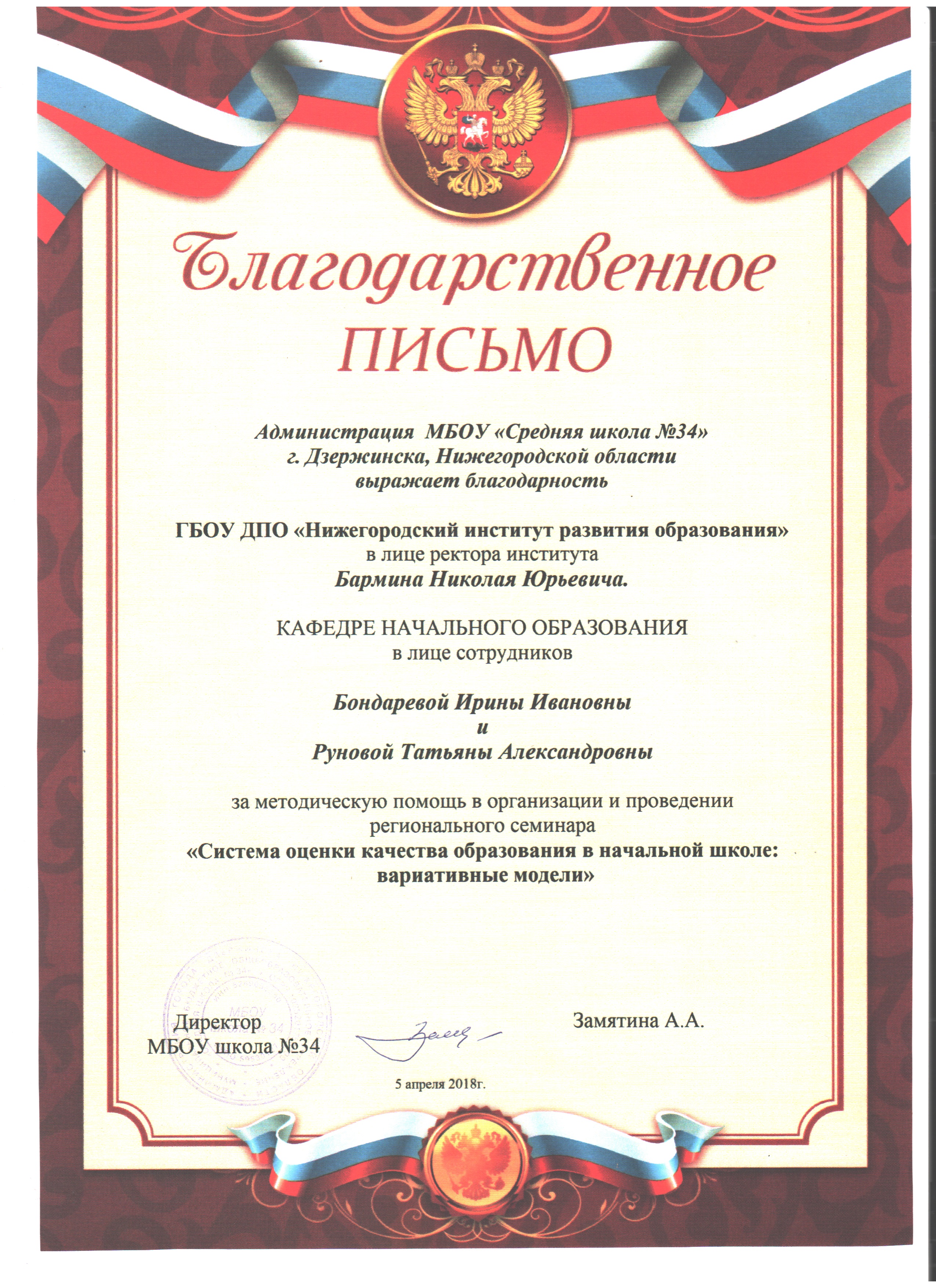 - Благодарность от Администрации МБОУ "Средней школы № 34" г. Дзержинска, Нижегородской области