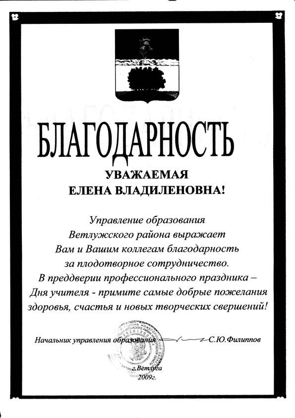 - Благодарность от Управления образования администрации Сергачского муниципального района Нижегородской области