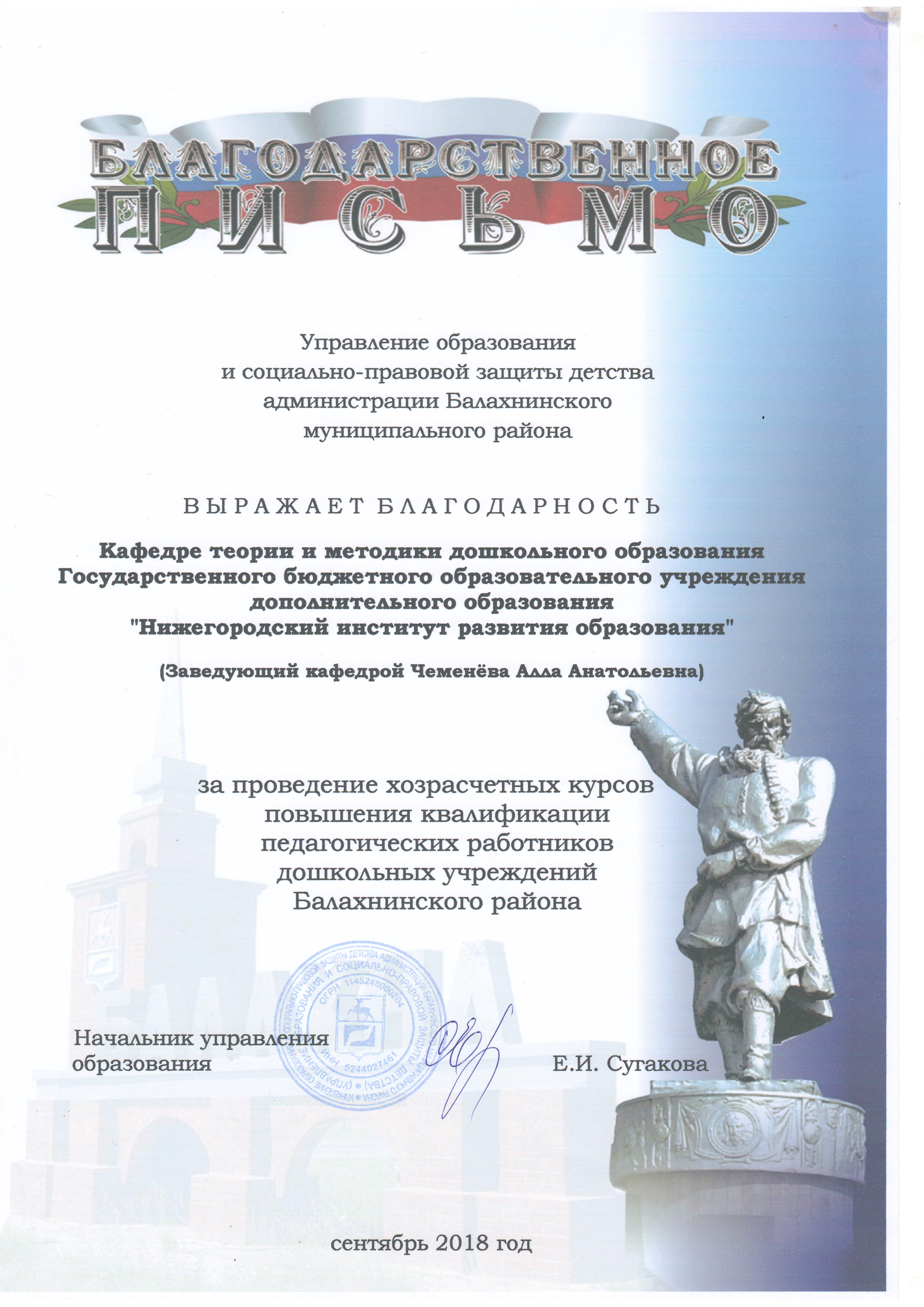 - Благодарность от управления образования и социально-правовой защиты детства администрации Балахнинского муниципального района