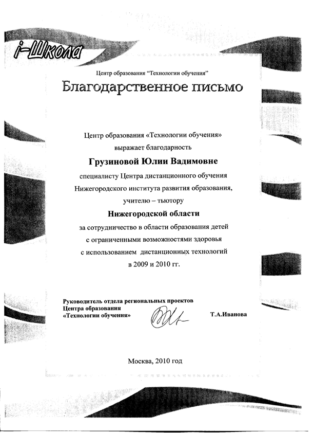 - Благодарность от администрации ГБОУ "Лицей-интернат "ЦОД"