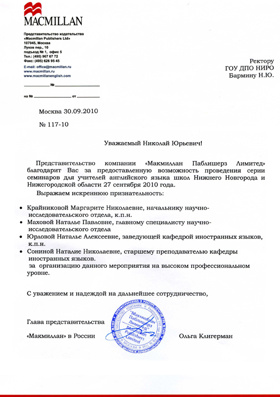 - Благодарность от Национальной ассоциации преподавателей английского языка